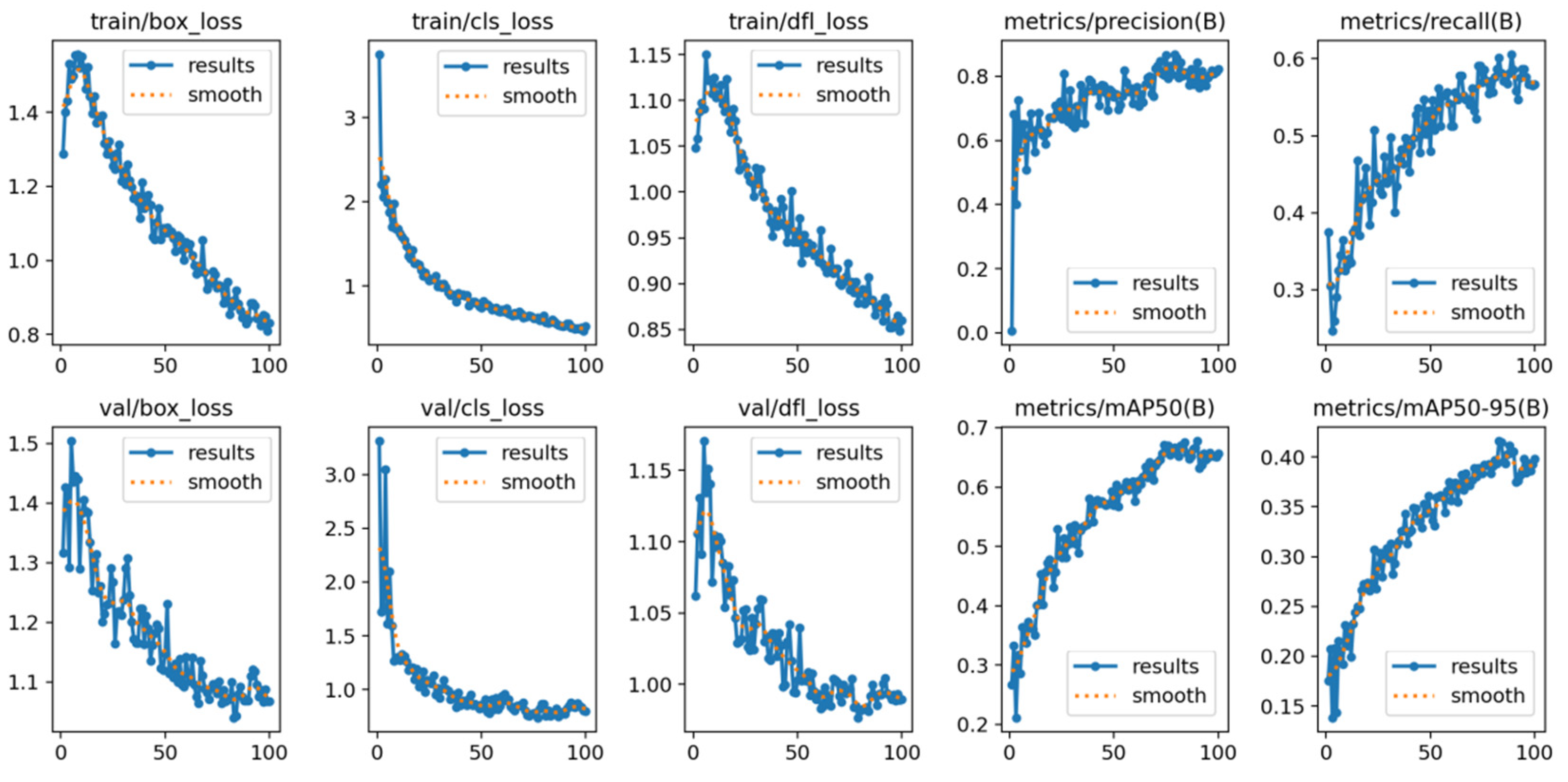 We optimized with stochastic gradient descent (SGD) using a momentum of 0.9 and a weight decay of 5 × 10−4. The initial learning rate was 0.01 and followed a cosine-annealing schedule over the course of training. We employed standard data augmentations—random scaling, random cropping, and horizontal flipping—and adopted the same anchor configuration as the YOLOv11n baseline. Unless otherwise noted, these settings were kept identical across all compared models to ensure fair and reproducible comparisons.