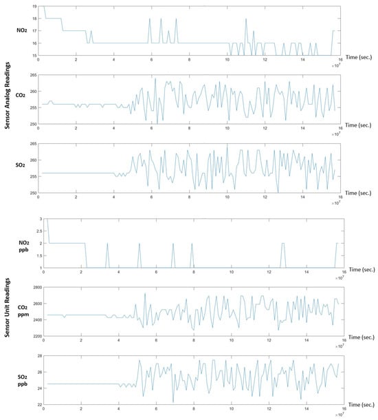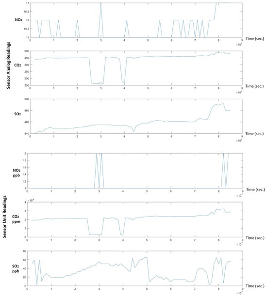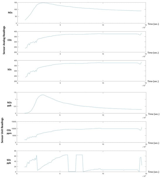 The atmosphere is composed mainly of nitrogen (78%), oxygen (21%), and trace gases, including carbon dioxide (CO2), sulfur dioxide (SO2), and nitrogen dioxide (NO2). These gases, while naturally occurring, can reach hazardous levels due to anthropogenic activities—especially fossil fuel combustion, industrial emissions, and transportation [,]. Monitoring their presence and behavior is critical for assessing environmental and public health risks [,,].