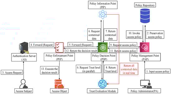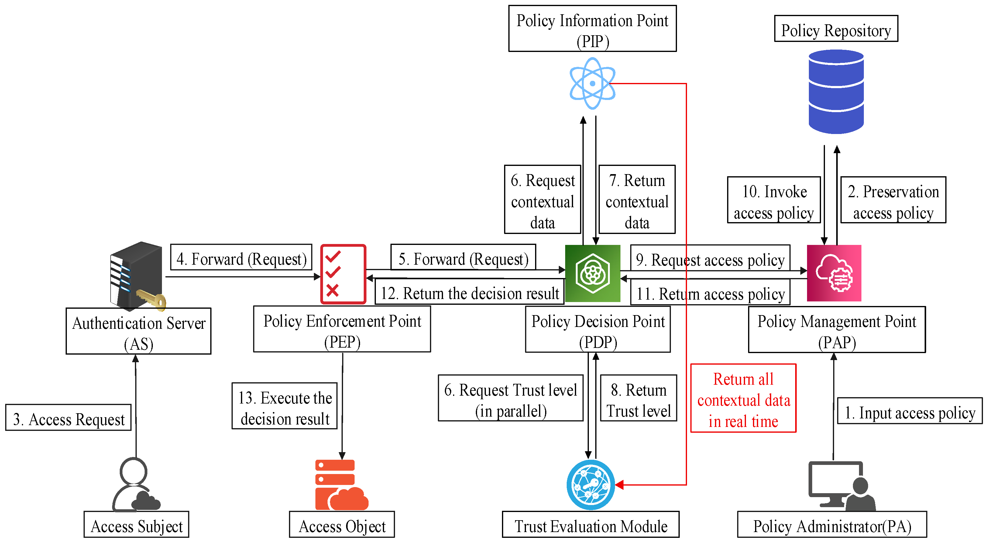 - The PDP requests the PIP for attribute information (of the access subject, object, and system environment) and related contextual data, and simultaneously queries the trust evaluation module to obtain the subject’s current trust level.