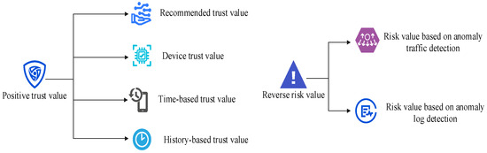 In the access control model proposed in this paper, the access subject’s trust level score is an important basis for access decisions. Contextual data is continuously collected and transmitted by the PIP, and the user’s real-time dynamic trust level is calculated using a trust level evaluation algorithm. As shown in Figure 2, the trust level is determined by both positive trust value and reverse risk value. Positive trust values include recommended trust value, device trust value, time-based trust value, and history-based trust value, which are used to evaluate the trustworthiness of entities. Negative risk values consist of abnormal traffic detection results and abnormal log detection results, which are used to evaluate negative indicators of the system and quantify potential risk factors of the system. Only by comprehensively considering trust and risk factors can trust evaluation be effectively conducted to further guide access control.