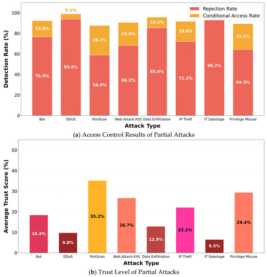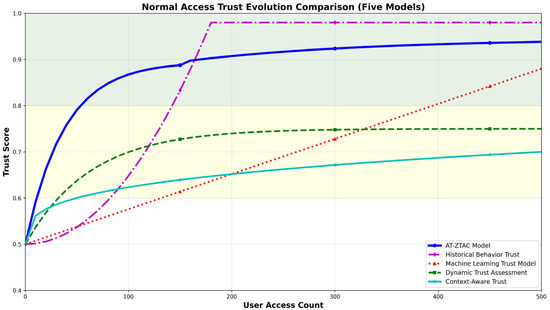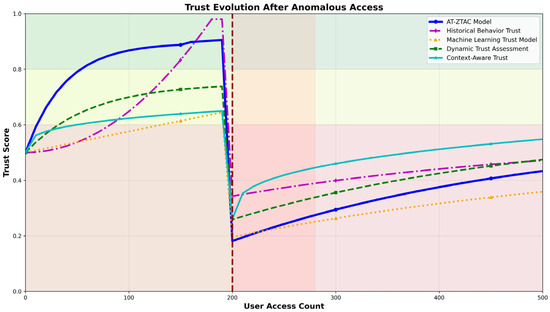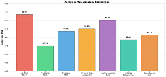 As shown in Figure 9, the access control rate of the AT-ZTAC model is 96.8%, significantly higher than that of other models (the control rate of the traditional RBAC model is 87.5%, the control rate of the traditional ABAC model is 91.8%, the control rate of the dynamic trust evaluation model is 92.6%, the control rate of the machine learning trust model is 95.1%, the control rate of the historical behavior-based trust model is 89.3%, and the control rate of the context-aware trust model is 90.7%). The core advantage lies in the deep integration of dynamic trust scores and attribute policies: quantifying real-time user status through trust level, accurately distinguishing low-risk anomalies from high-risk malicious behaviors, avoiding false positives or missed judgments caused by rough static attribute judgments in traditional models, and further improving decision-making accuracy through the BLS multi-signature endorsement mechanism.