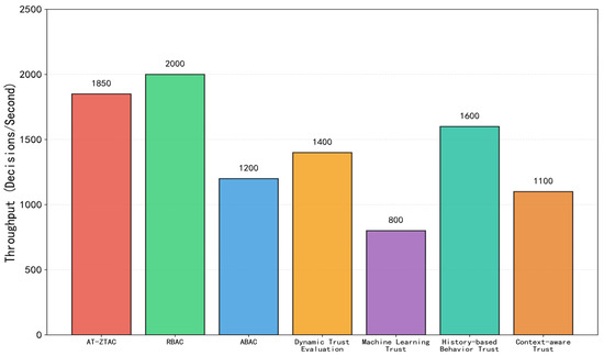 As shown in Figure 8, the maximum access decision throughput of AT-ZTAC reaches 1850 req/s, which is a 54% increase compared to traditional ABAC (1200 req/s). The core reason is that the BLS aggregate signature simplifies the verification of multi-node signatures into a single verification. Moreover, since the trust score is incorporated into the ABAC decision policy as a key attribute, the policy retrieval range is limited to a specific trust threshold interval, reducing the decision space. Compared with the dynamic trust evaluation model (1400 req/s) and the context-aware trust model (1100 req/s), the throughput of AT-ZTAC has increased by 32% and 68%, respectively. The core reason is that the trust evaluation module in AT-ZTAC adopts asynchronous computing and hot-spot caching technologies, which effectively reduce performance loss and can meet the high-concurrency access requirements of cloud environments. However, the other two models still use a serial evaluation method: they only perform trust calculation after receiving a request and make access decisions only after the calculation is completed. When trust evaluation takes a long time, it will significantly increase the access response time. In addition, the AT-ZTAC model also has certain advantages over the history-based behavior trust model (1600 req/s), which may be due to the sliding window mechanism it adopts, which weakens the impact of distant data on the current evaluation and reduces computational overhead. The machine learning trust model has the lowest throughput (only 800 req/s), which is related to the large computational time consumption caused by its complex model. The traditional RBAC model has the highest throughput (2000 req/s) due to its simple policy structure, but RBAC has obvious deficiencies in dynamic access control and security, and cannot achieve accurate and adaptive decision-making capabilities.