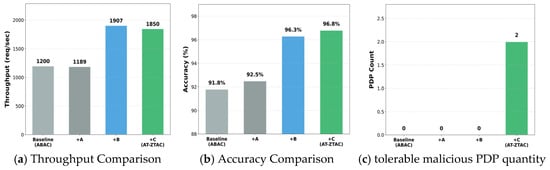 As shown in Figure 10, in terms of throughput, the throughput of the baseline ABAC is 1200 req/s; after adding Component A, the throughput drops to 1189 req/s. This is because Component A adds continuous identity verification compared to the baseline model. Although it only calculates changed attributes, there is still a small additional overhead, leading to a slight performance loss. After adding Component B, the throughput jumps to 1907 req/s (a 59% increase compared to the baseline). The core reason is that the addition of Component B reduces the policy search range to the trust value interval. At the same time, the adoption of asynchronous computing and hot-spot caching mechanisms decouples the serial dependence between trust evaluation and access decision-making, avoiding the performance bottleneck of real-time trust value calculation. After further adding Component C, the throughput drops to 1850 req/s (still a 54% increase compared to the baseline). The aggregation feature of the BLS signature simplifies multi-signature verification into a single operation, effectively controlling performance loss, but a multi-node signature still incurs slight computational overhead. In terms of accuracy, the accuracy of the baseline ABAC is 91.8%; after adding Component A, the accuracy increases to 92.5%, indicating that the continuous verification of zero trust can initially filter dynamic risks. After adding Component B, the accuracy significantly increases to 96.3% (a 4.5% increase compared to the baseline). The key lies in that Component B quantifies users’ real-time status through positive trust values and reverse risk values, accurately distinguishing legitimate access from malicious behaviors, and solving the misjudgment problem of static attributes in traditional ABAC. After adding Component C, the accuracy further increases to 96.8%, because the BLS threshold signature requires joint endorsement of decisions by multiple PDP nodes, reducing incorrect authorization caused by single-node failures or tampering. This proves that Component B is the core for improving accuracy, and Component C further enhances decision reliability. In terms of tolerable malicious PDP quantity, the baseline ABAC (single-PDP architecture) cannot tolerate malicious nodes (the system fails after being compromised); after adding Component A or B, the tolerable quantity does not change, as neither involves the fault-tolerance design of the control plane. After adding Component C, the number of tolerable malicious nodes increases to 2, indicating that the threshold signature scheme of Component C effectively disperses the trust risk of the control plane and significantly improves the system’s fault-tolerance capability.