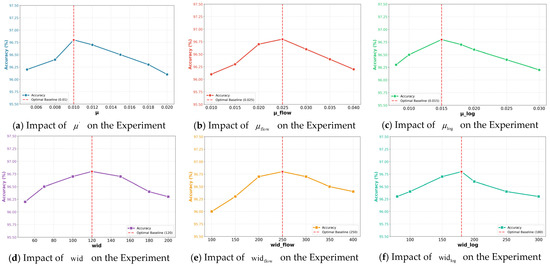 As shown in Figure 11, the optimal values and robustness characteristics of the key hyperparameters of the AT-ZTAC model are clear: the optimal baselines of the time adjustment factor for history-based trust value (), time adjustment factor for traffic risk (), and time adjustment factor for log risk () are 0.01, 0.025, and 0.015, respectively; the optimal baselines of the window size for history-based trust value (), window size for traffic risk (), and window size for log risk () are 120, 250, and 180, respectively. At this time, the model’s accuracy reaches its highest. When each parameter is within the corresponding reasonable range (ranges from 0.005 to 0.02, ranges from 0.01 to 0.04, ranges from 0.008 to 0.03, ranges from 50 to 200, ranges from 100 to 400, ranges from 80 to 300), the accuracy can be maintained above 96%. Even if the parameters deviate from the optimal values, the maximum accuracy drop is no more than 0.8%, fully proving that the model has low sensitivity to hyperparameter changes and strong robustness.