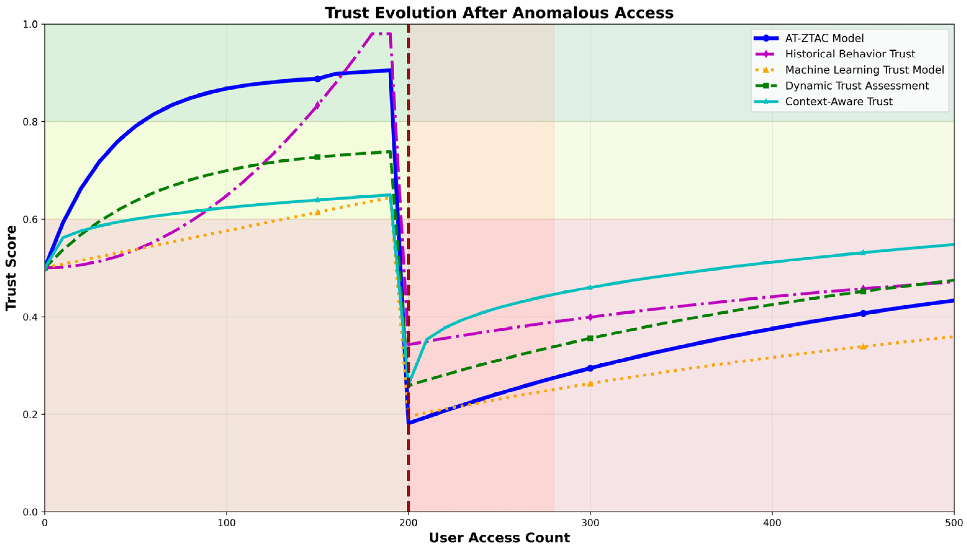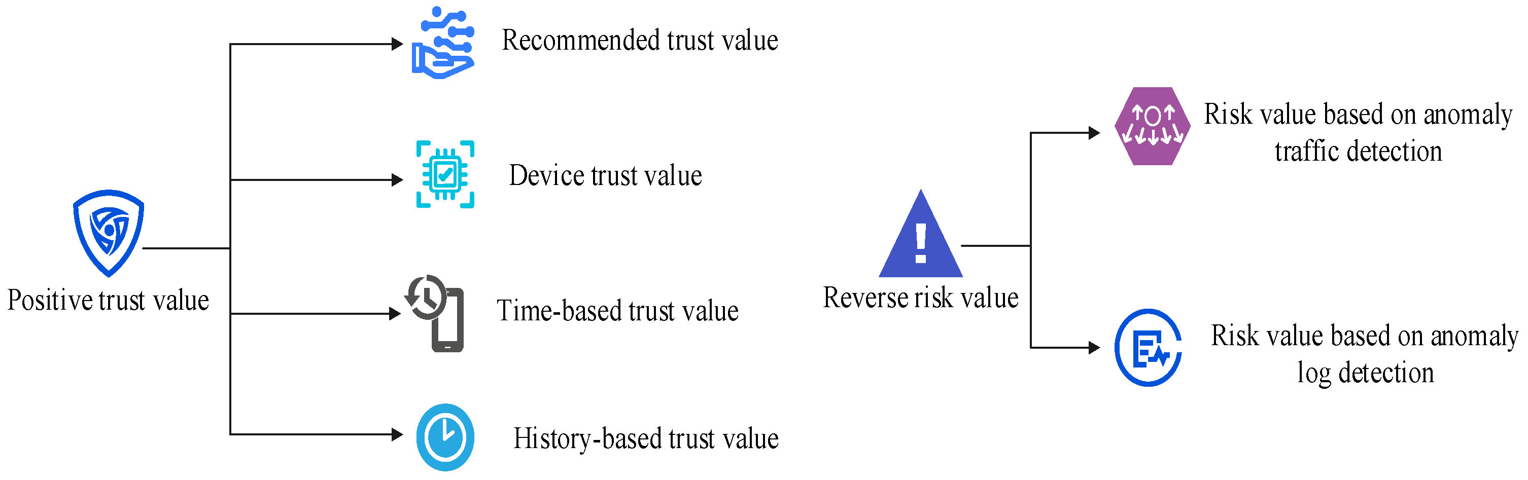 | ABAC Model and Its Improved Models | [3,18,19,20,21,22,23,24] | Makes decisions based on multi-dimensional attributes; supports fine-grained control; some integrate optimization technologies (timestamps, blockchain, encryption, deception technologies) and are relatively suitable for dynamic scenarios. | Heavily relies on static attributes/policies, with insufficient session-level continuous verification; weak risk perception, difficult to respond to internal threats. | Real-time trust evaluation + session-level continuous verification; permissions dynamically adjusted with trust level; real-time quantification of threats via reverse risk values to quickly respond to internal threats. |