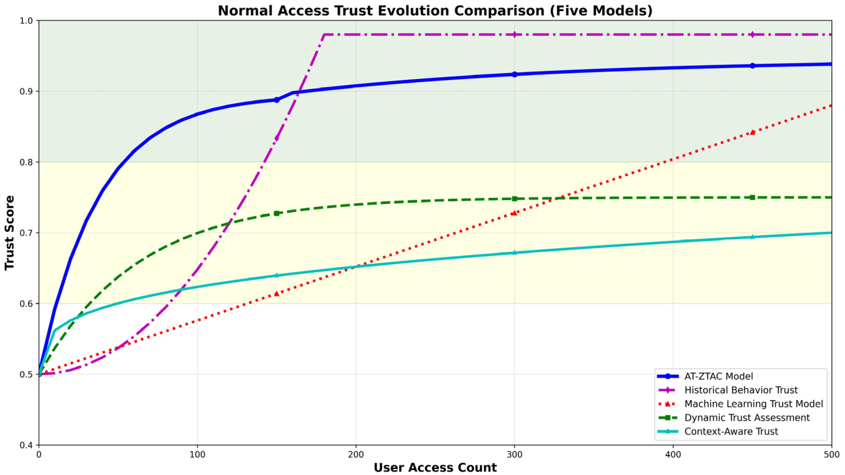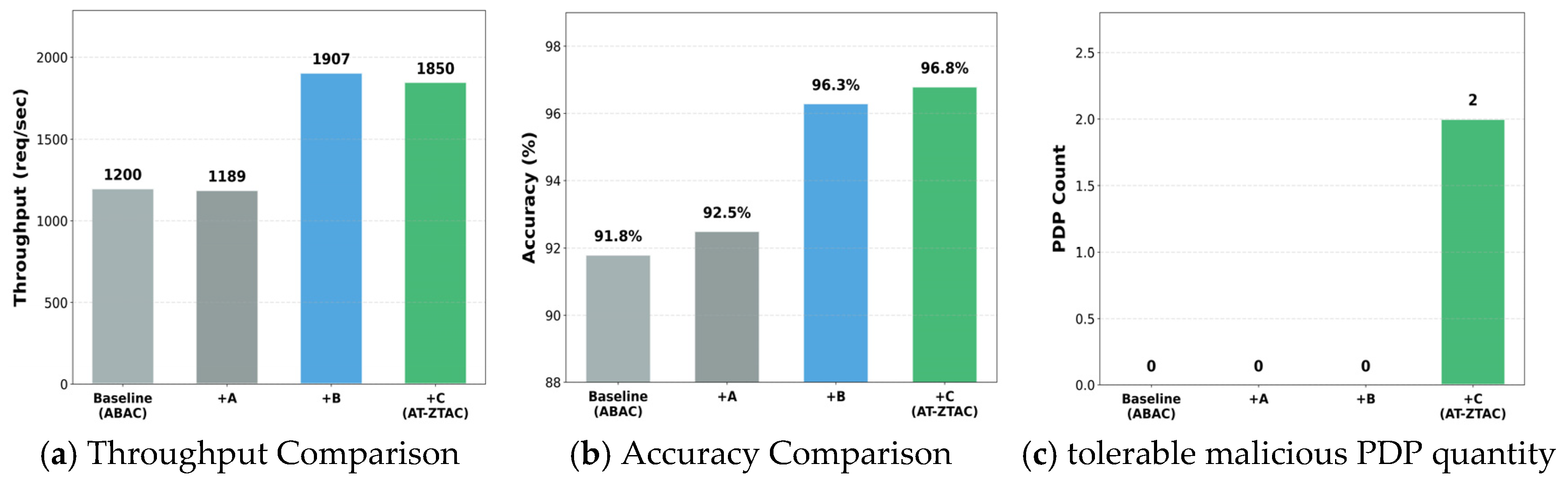 | AT-ZTAC (Proposed in This Study) | - | Deeply integrates zero trust + ABAC + dynamic trust evaluation; BLS threshold signature ensures control plane security. | - | Simultaneously addresses three core issues: insufficient dynamic adaptability, weak risk perception, and single-point trust risk in the control plane. |
