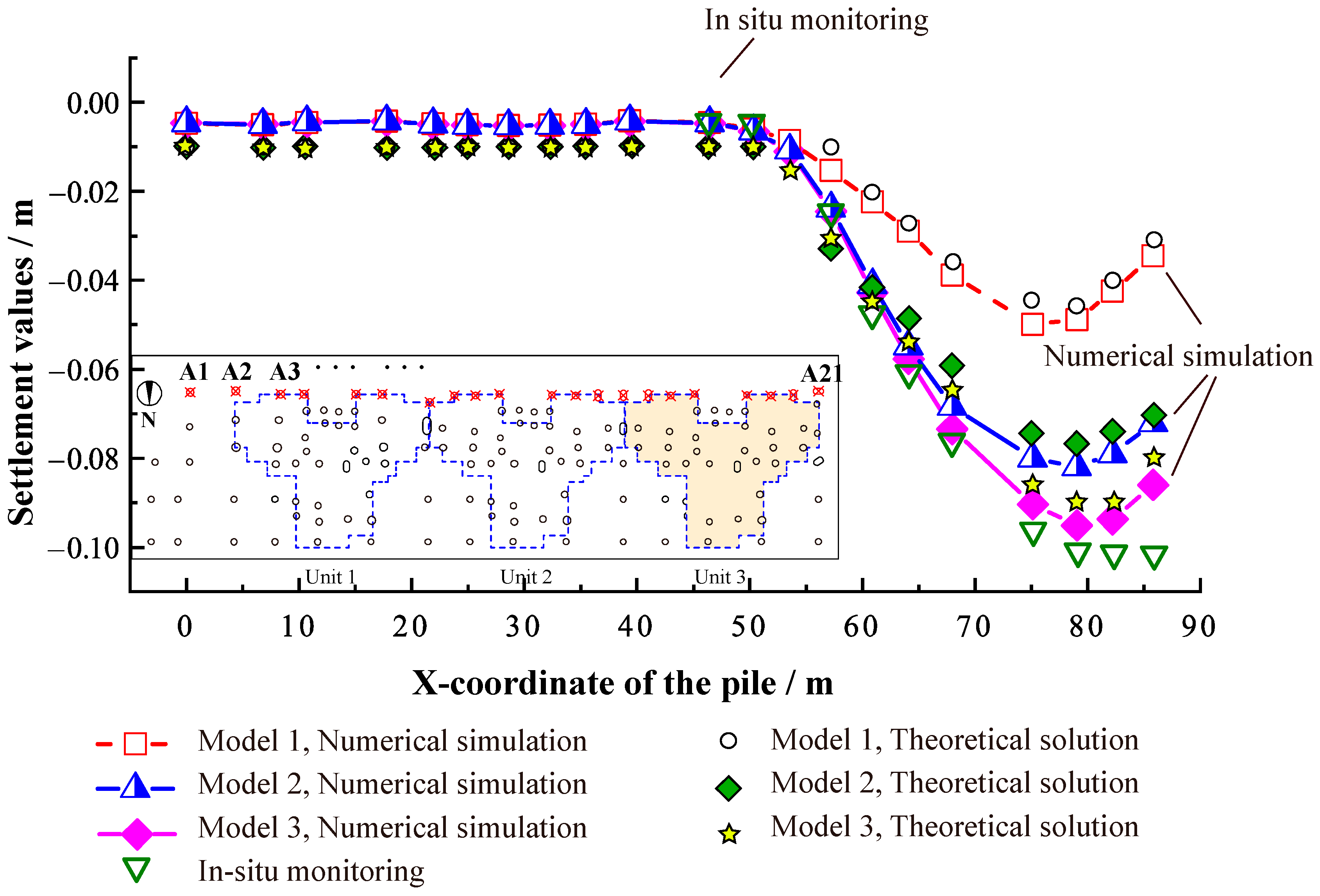 4.4.1. Comparison of Theoretical, Numerical, and Monitoring Values for Pile Cap Settlement