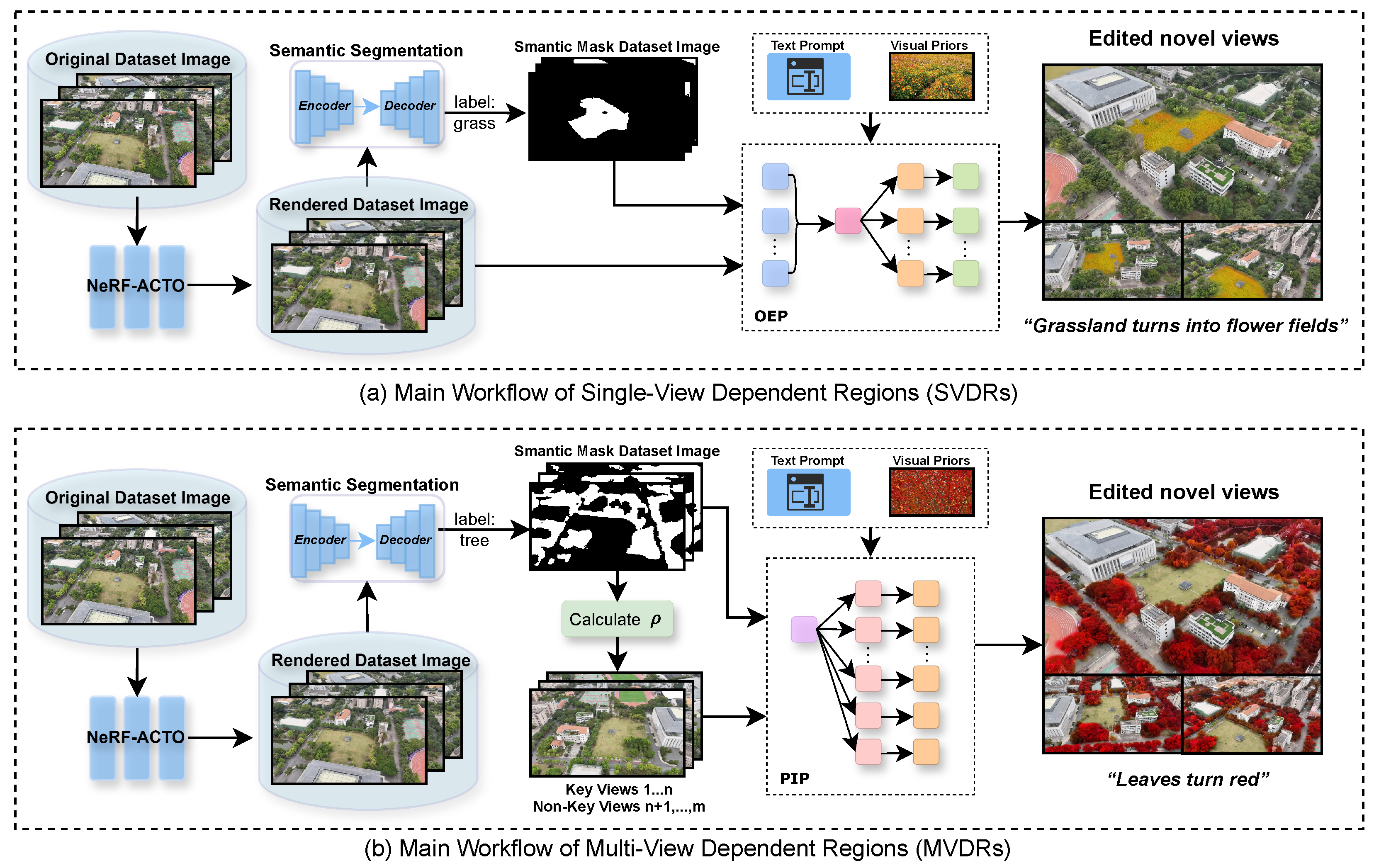 - An Optimal Editing Propagation (OEP) method is proposed based on TDB metrics to strengthen multi-view scene continuity for Single-View Dependent Regions (SVDRs) in UAV scenes. A subsequent Diffusion Refinement phase to further improve visual quality in target regions is included.