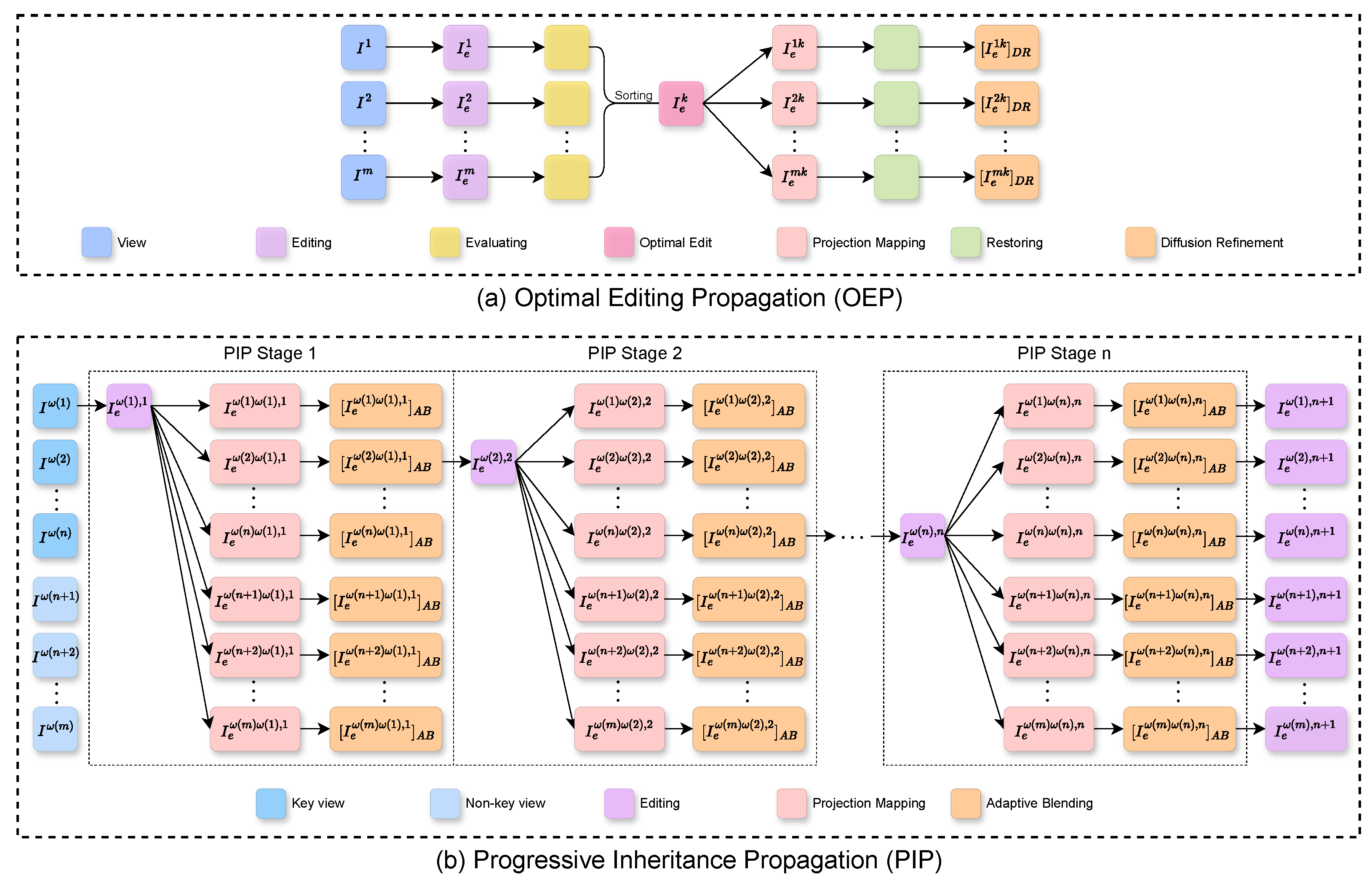 - A Progressive Inheritance Propagation (PIP) method is developed that employs Adaptive Blending to predict pixel-wise mixing weights, thereby balancing cross-view propagated edits with structural scene details and enhancing consistency in sparsely distributed Multi-View-Dependent Regions (MVDRs).