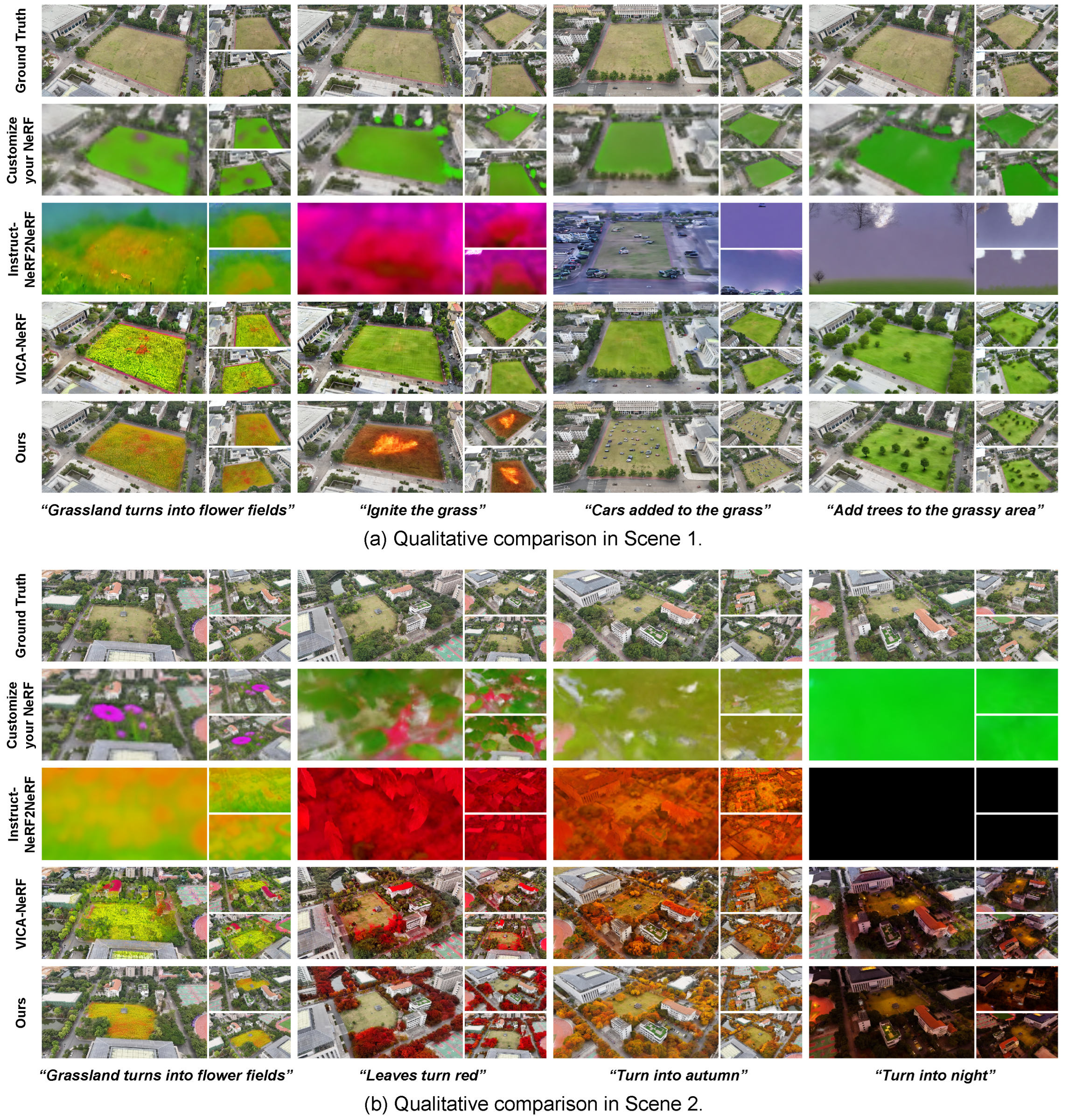 - Wang, Y.; Fang, S.; Zhang, H.; Li, H.; Zhang, Z.; Zeng, X.; Ding, W. UAV-ENeRF: Text-Driven UAV Scene Editing with Neural Radiance Fields. IEEE Trans. Geosci. Remote Sens. 2024, 62, 1–14. [Google Scholar] [CrossRef]