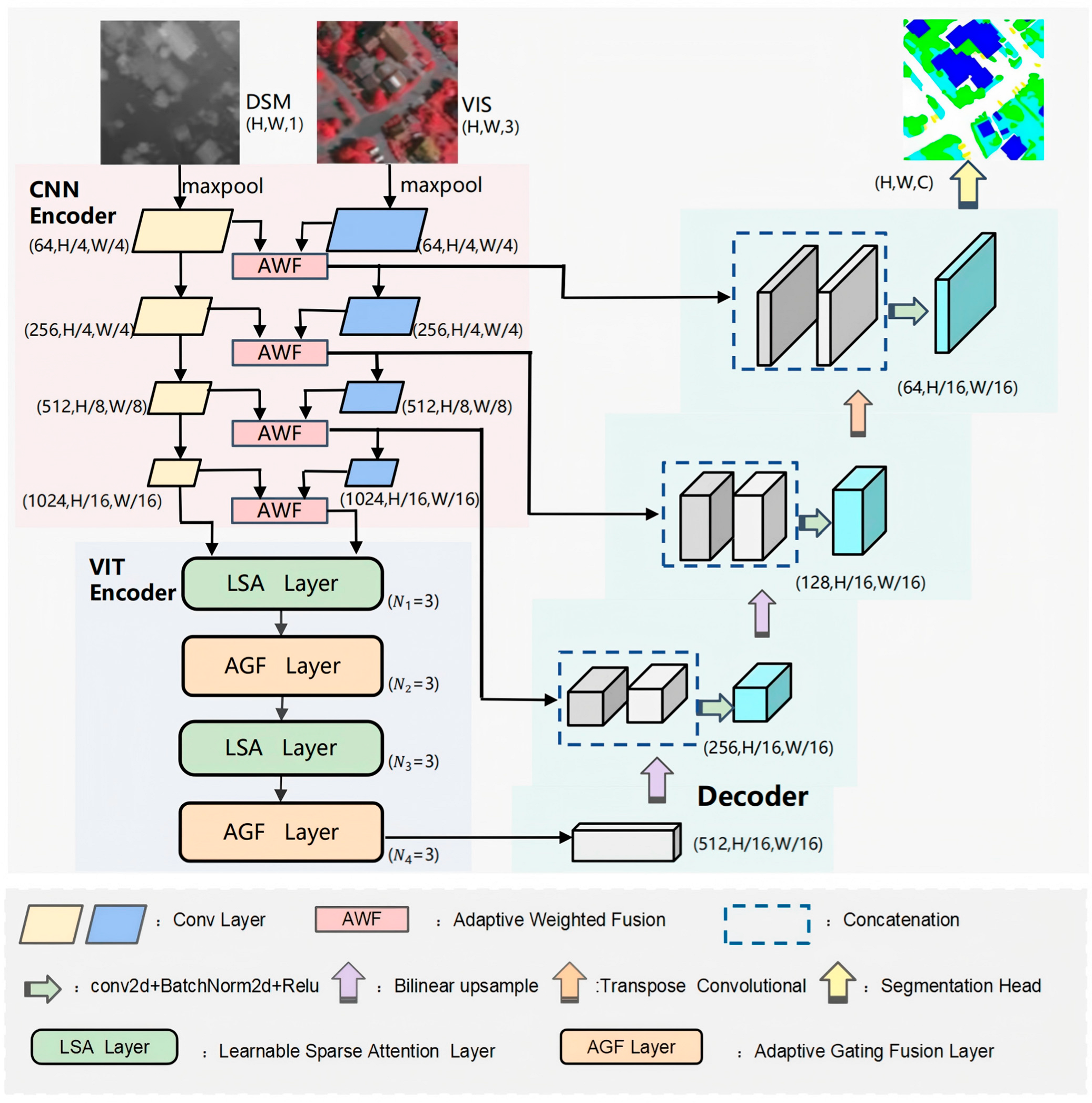 Specifically, the encoder is composed of four stages, each containing three layers. LSA blocks focus on selectively activating the most informative spatial positions, while AGF blocks perform modality-aware fusion of VIS and DSM features. By alternating LSA and AGF (three LSA layers followed by three AGF layers, repeated twice), the encoder gradually refines global context and cross-modal interactions.