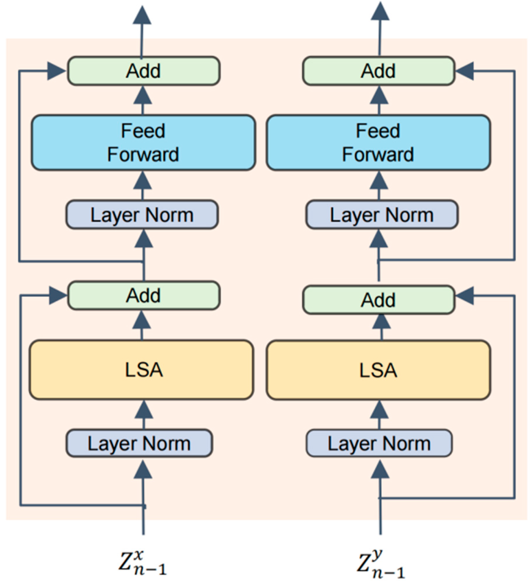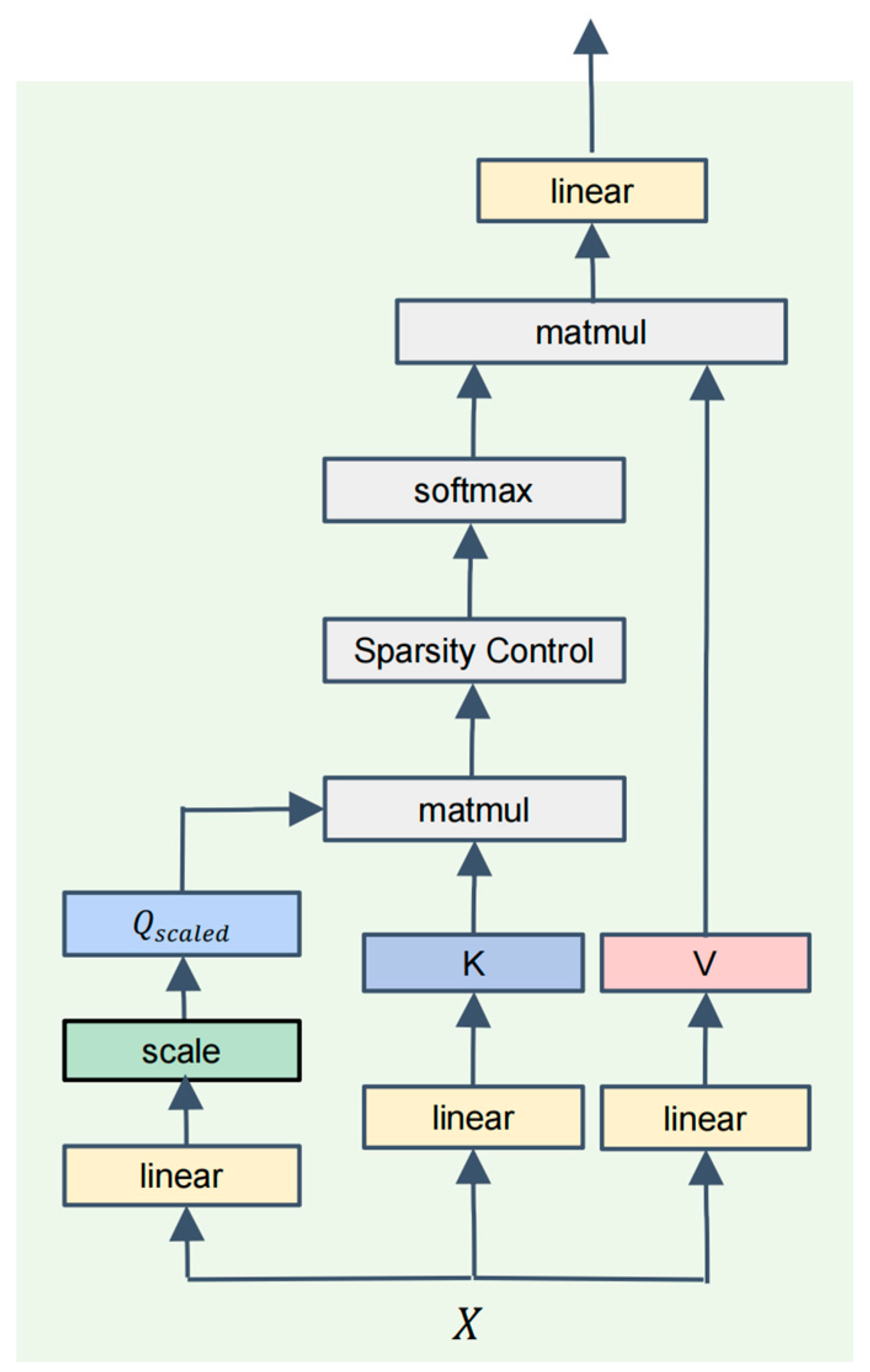 The LSA block extends the standard Transformer self-attention layer by introducing a learnable sparsity mechanism, which reduces redundant attention computations and improves efficiency. Its overall structure is illustrated in Figure 3, and the internal computation flow (Q/K/V projection, sparse attention, and output projection) is summarized in Figure 4.