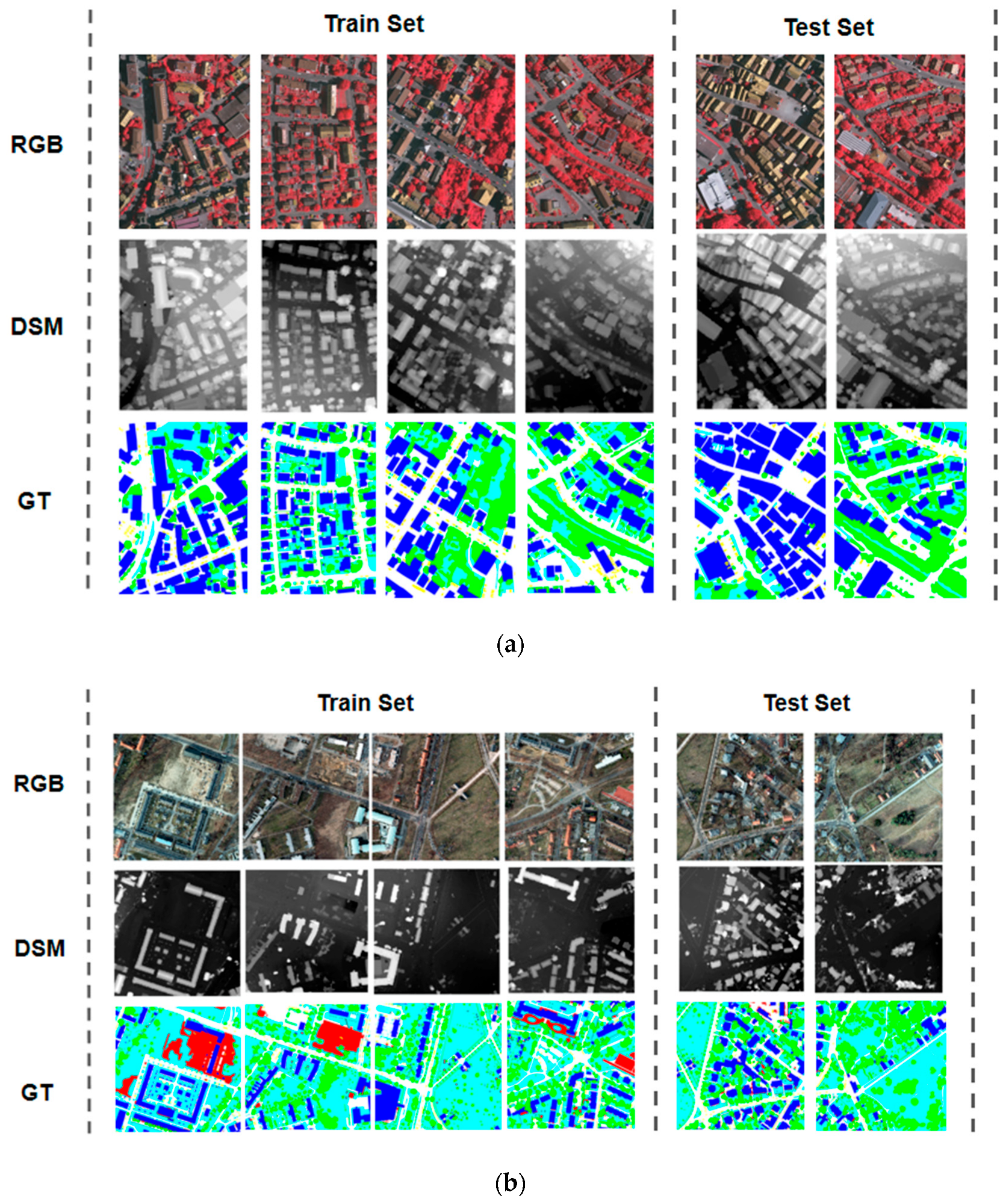 Multi-modal fusion is an effective way to improve segmentation accuracy and robustness by combining complementary geospatial data such as RGB/VIS imagery, Digital Surface Models (DSM), Digital Elevation Models (DEM) and LiDAR point clouds [43,44,45,46,47,48]. Recent work by Wang et al. [49], for example, fuses multi-temporal optical images with DEM data and demonstrates clear benefits in complex terrain, which is consistent with our motivation for VIS–DSM fusion.