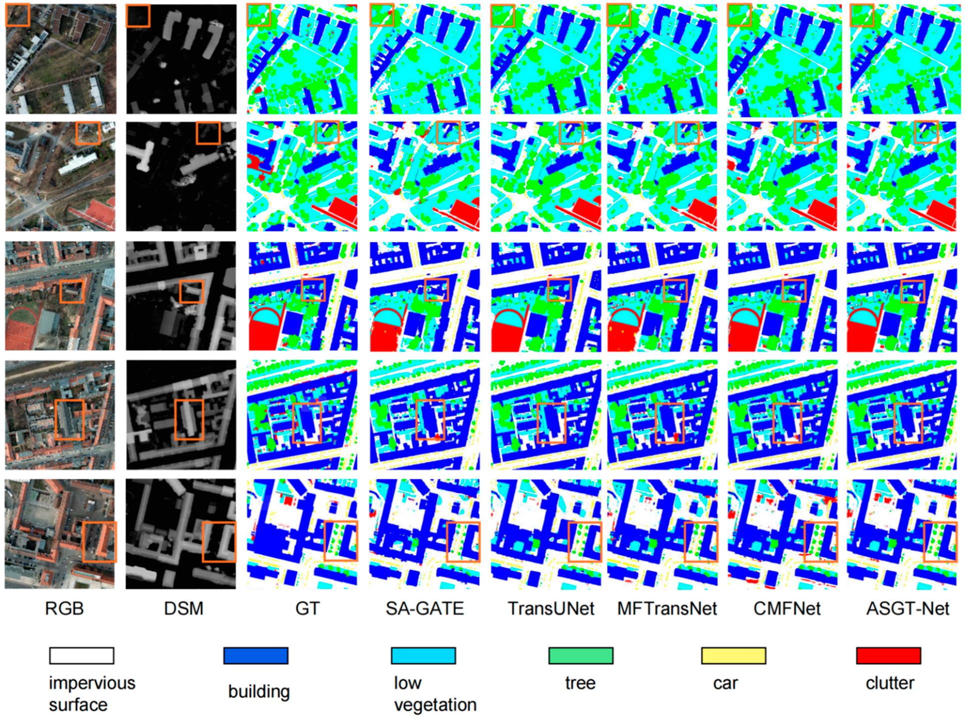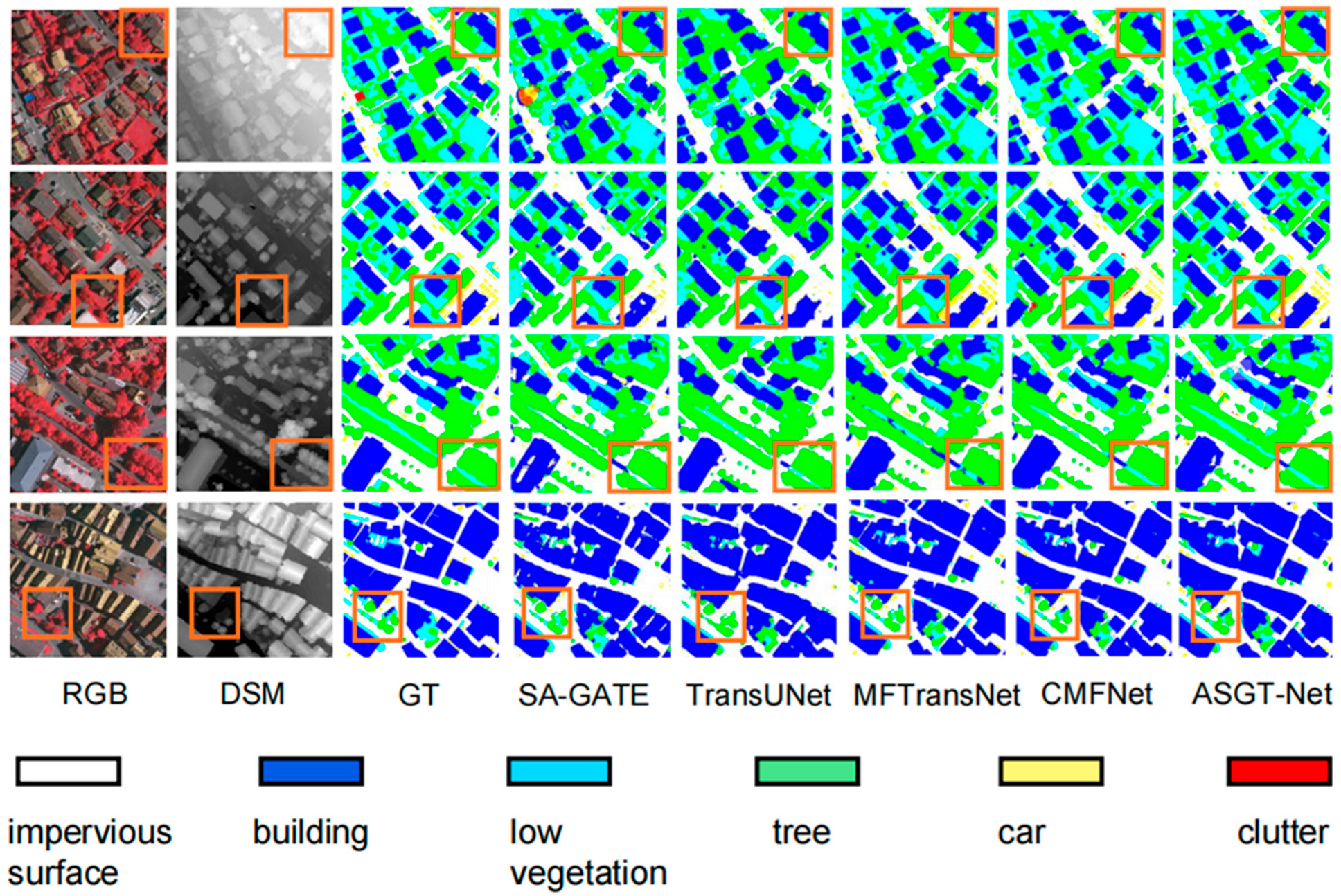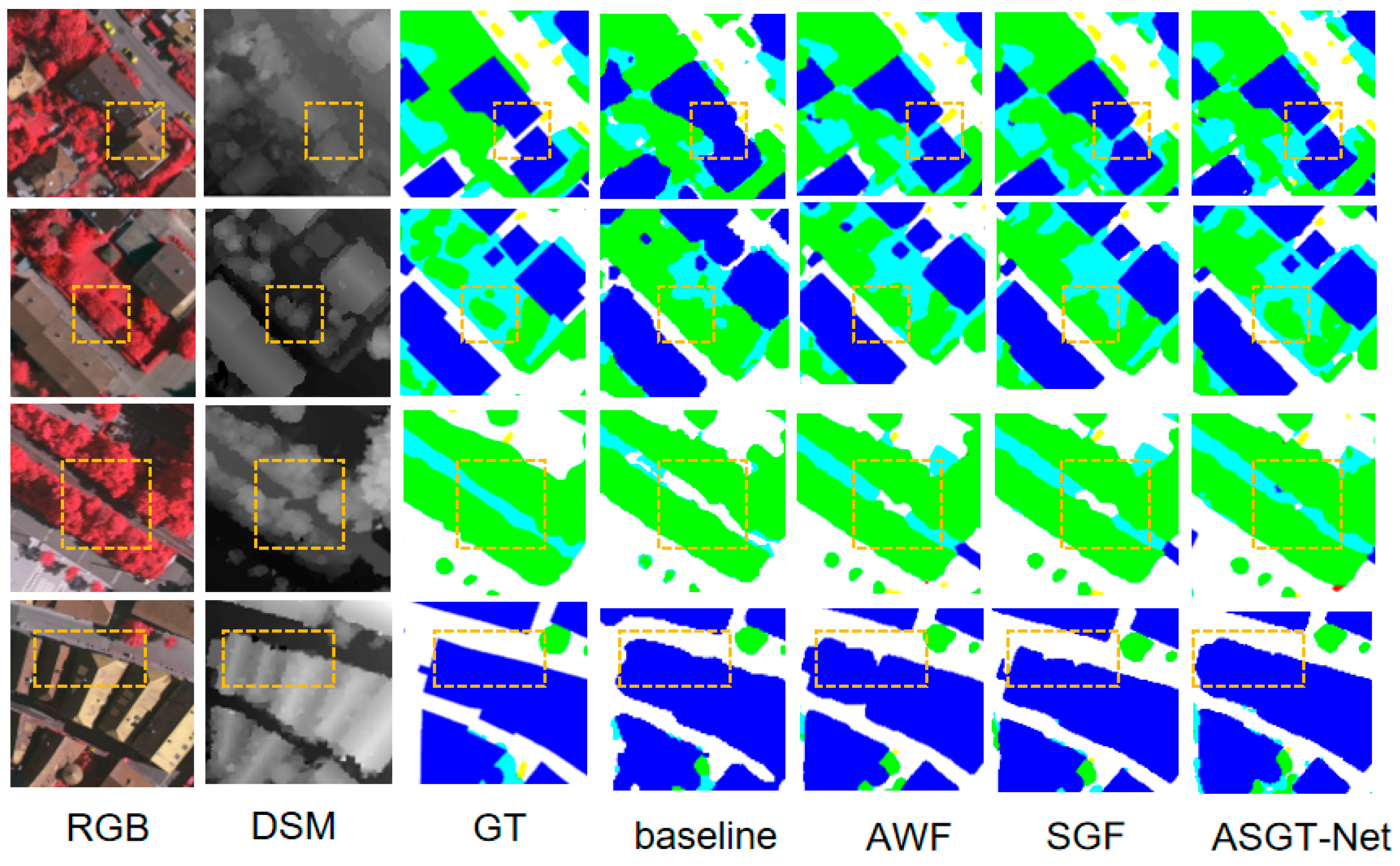 Through rigorous comparative experiments on the ISPRS Vaihingen and Potsdam datasets, results demonstrate that ASGT-Net significantly improves segmentation performance while maintaining low computational complexity, outperforming other state-of-the-art multi-modal fusion methods. These experiments validate ASGT-Net’s superiority in efficiently fusing multi-modal data, enhancing accuracy, and improving computational efficiency.