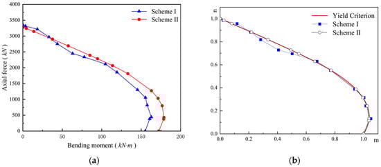 The yield axial force and yield bending moment of each scheme under different working conditions are summarized in Figure 5a. The experimental points from the compression–bending tests in the M-N curve are nondimensionalized, and both the theoretical m-n curve and the numerical simulation test points are plotted, as shown in Figure 5b.
