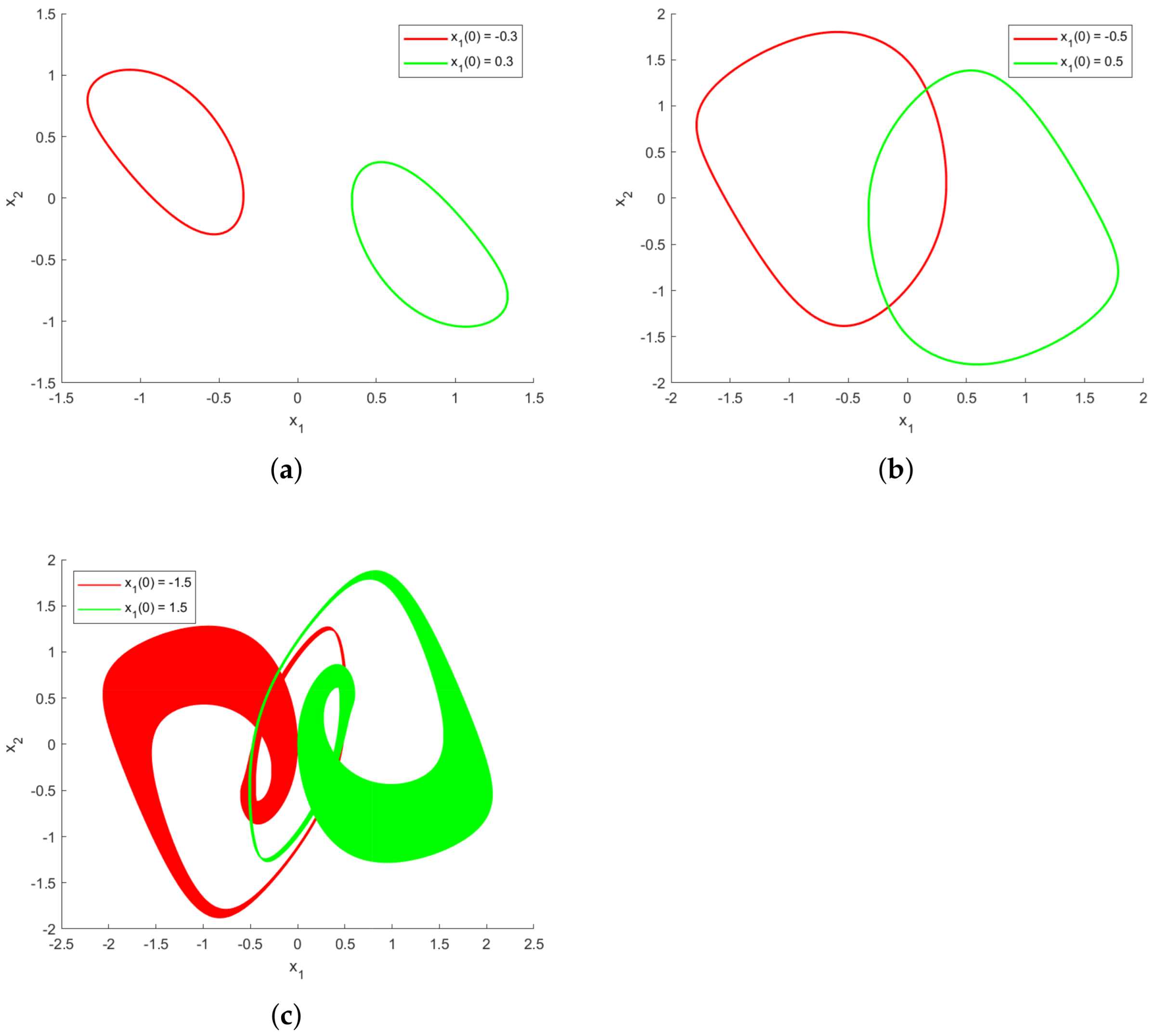 Yet, since for non-zero , the divergence typically remains negative, signifying a dissipative system. A Lyapunov function further confirms bounded motion, as its derivative turns negative for large , supporting the presence of attractors.