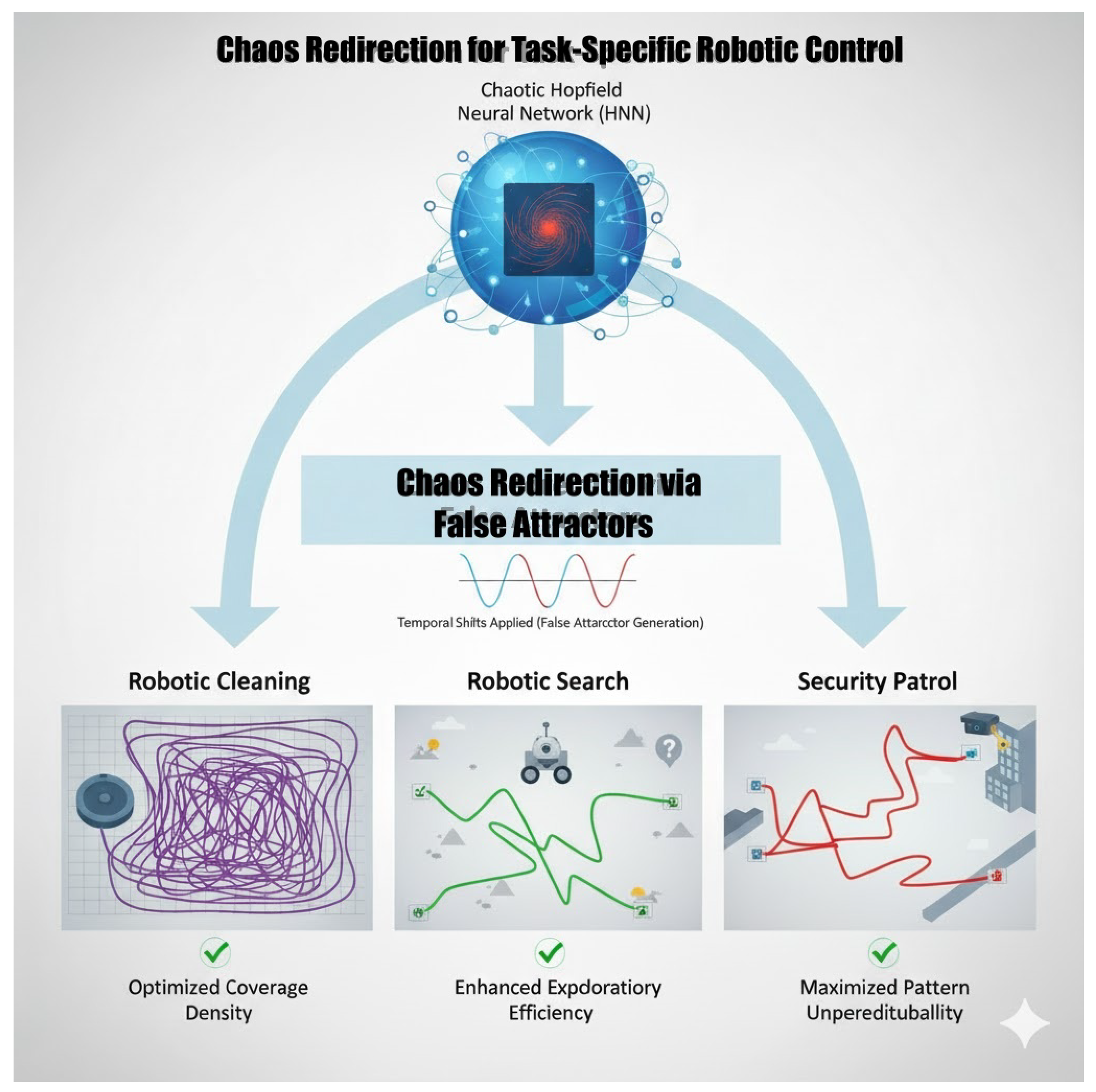 This study presents and validates a new control paradigm, termed “chaos redirection”, which employs a single chaotic Hopfield Neural Network alongside synthetic “false attractors” to produce statistically robust, task-specific robotic behaviors. The simulation analysis produced three main qualitative outcomes. The security robot demonstrated “controlled unpredictability” by being effectively restricted to a compact patrol zone, resulting in a markedly higher frequency of re-visitation relative to exploratory behaviors, thereby validating its appropriateness for continuous surveillance. In contrast, the search robot was optimized for discovery, encompassing the greatest total area at the highest speed while minimizing path overlap, thereby exhibiting maximal exploratory efficiency. The cleaning robot generated distinct, high-entropy paths marked by significant pattern unpredictability, facilitating non-repetitive and comprehensive coverage appropriate for complex or irregular spaces. This study illustrates that actively shaping chaotic dynamics, instead of simply utilizing or suppressing them, serves as an effective and resilient approach for producing a variety of high-performance behaviors in autonomous systems from a singular, integrated control core. This study established performance baselines in obstruction-free zones to validate the core “chaos redirection” mechanism in operational environments. The inherent characteristics of the produced behaviors indicate significant robustness in complex, real-world situations. Future research will expand this framework to include cluttered environments, examining the hypothesis that the high-entropy “Cleaning” behavior can effectively navigate irregular obstacles and non-convex search areas, avoiding the local minima entrapment commonly seen in deterministic potential field methods.