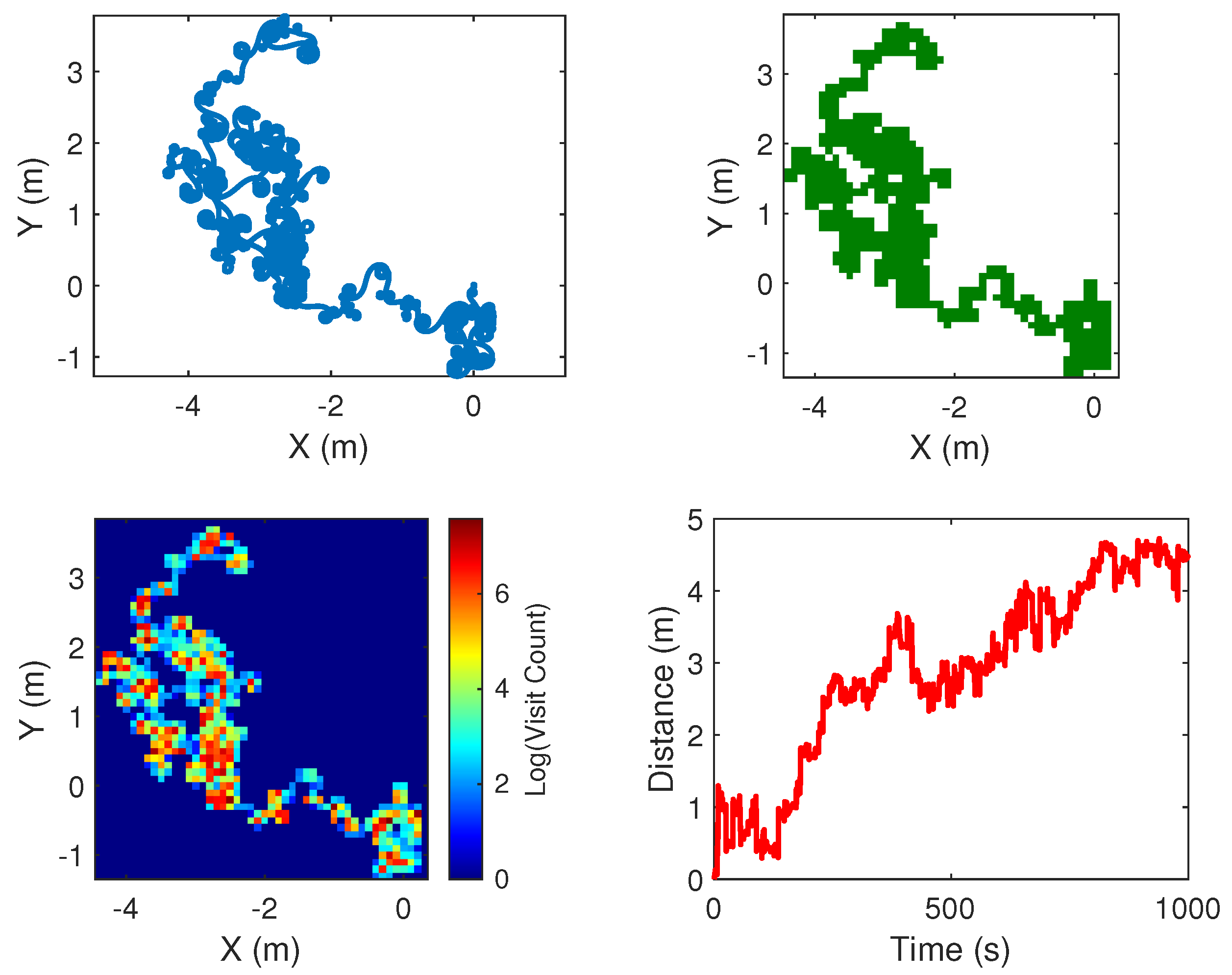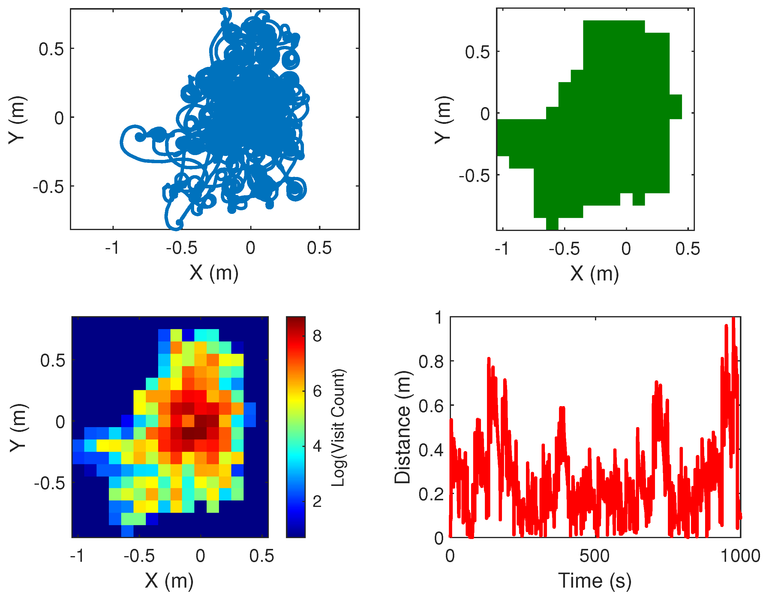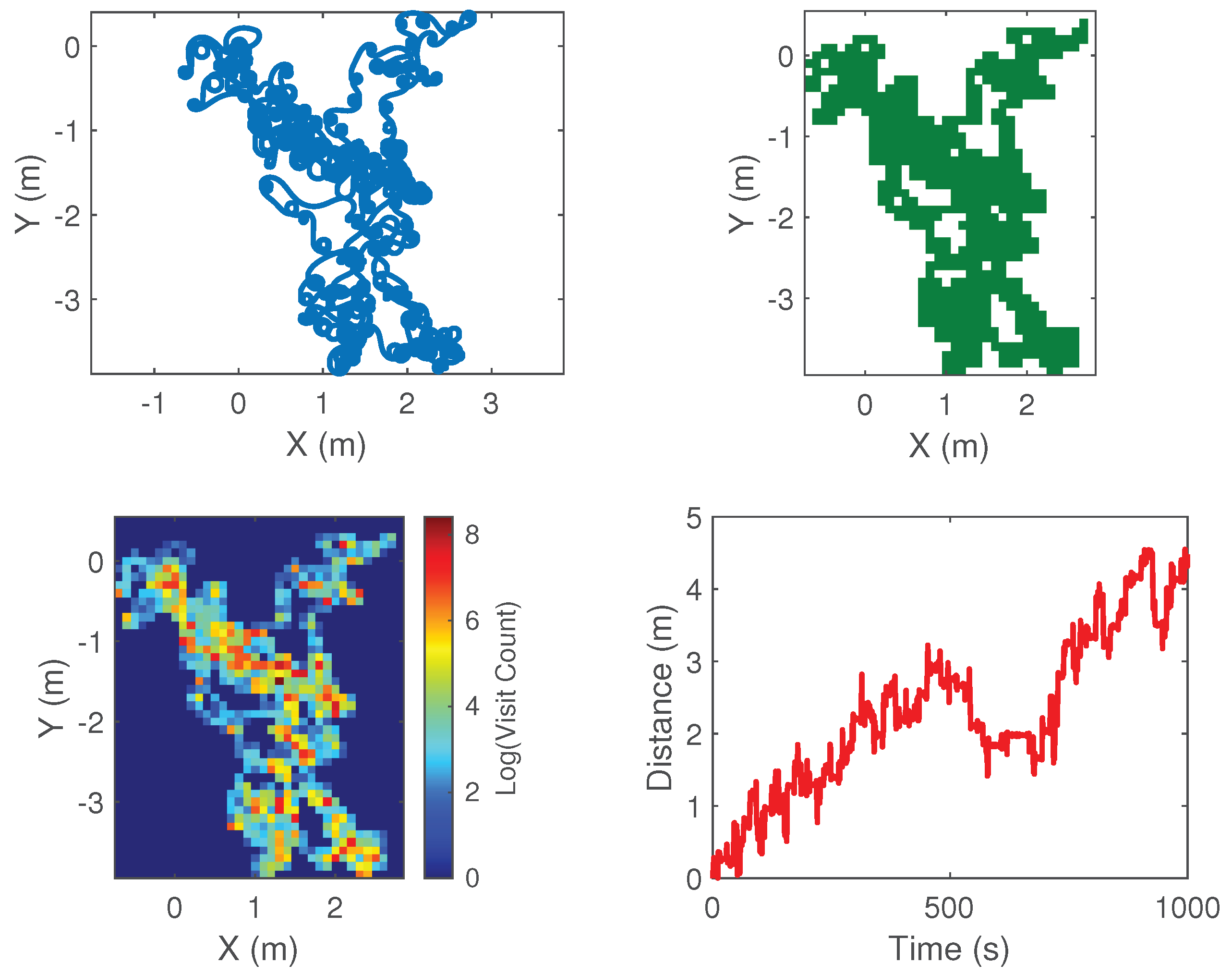 Area Coverage: The two-dimensional space is divided into a grid consisting of cells measuring 0.1 m × 0.1 m. This metric quantifies the overall expanse of distinct cells traversed by the robot.