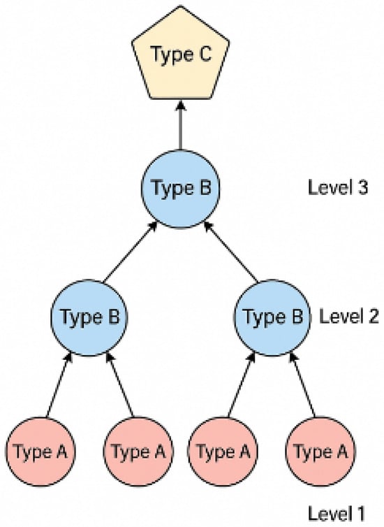 Figure 1 illustrates a generic schematic representation of a heterogeneous multi-level graph, where nodes belong to different types and are organized across hierarchical levels. In these structures, each node type (e.g., Type A, Type B, Type C) occupies a distinct partition, and edges appear only between nodes from adjacent levels, reflecting the layered multi-partite organization. Such graphs support representation learning by enabling message passing across node types, where each level contributes complementary structural or contextual information to the others. This provides a flexible and expressive framework for modeling systems in which interactions are inherently multi-level and type dependent [23]. The diagram is intended to convey the hierarchical nature of these relationships rather than specify a particular domain or direction of information flow.