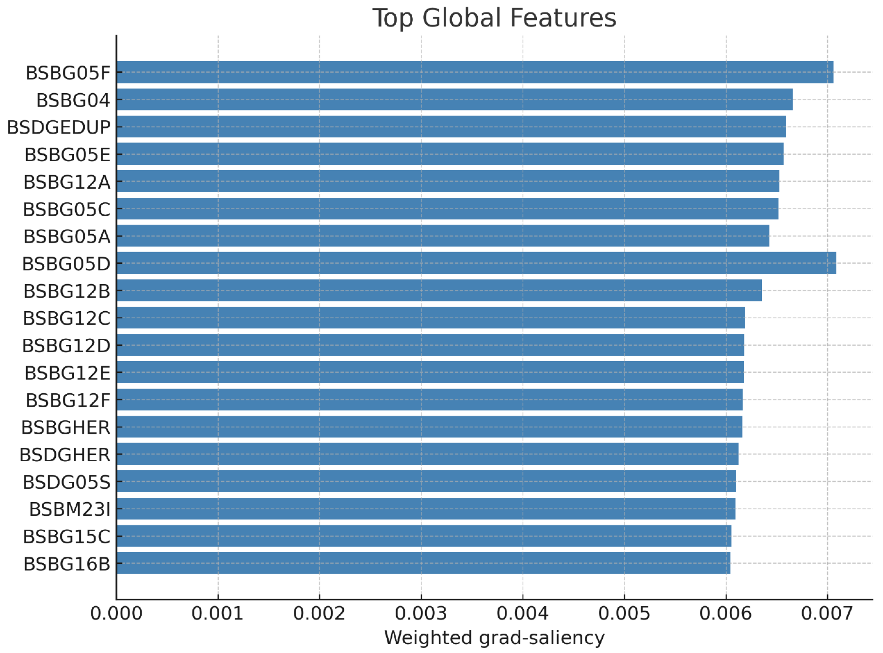 To address this, the best-performing GraphSAGE_Bayesian model was analyzed using GNNExplainer. GNNExplainer calculated the relative importance of each variable using weighted gradient-saliency scores. Since these scores are derived from the model’s gradient sensitivities, significance should be evaluated based on variable rankings and cumulative contributions [
