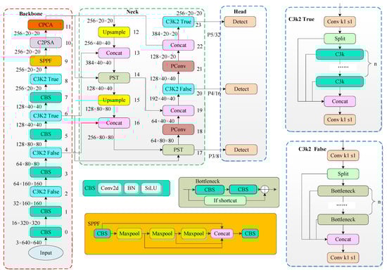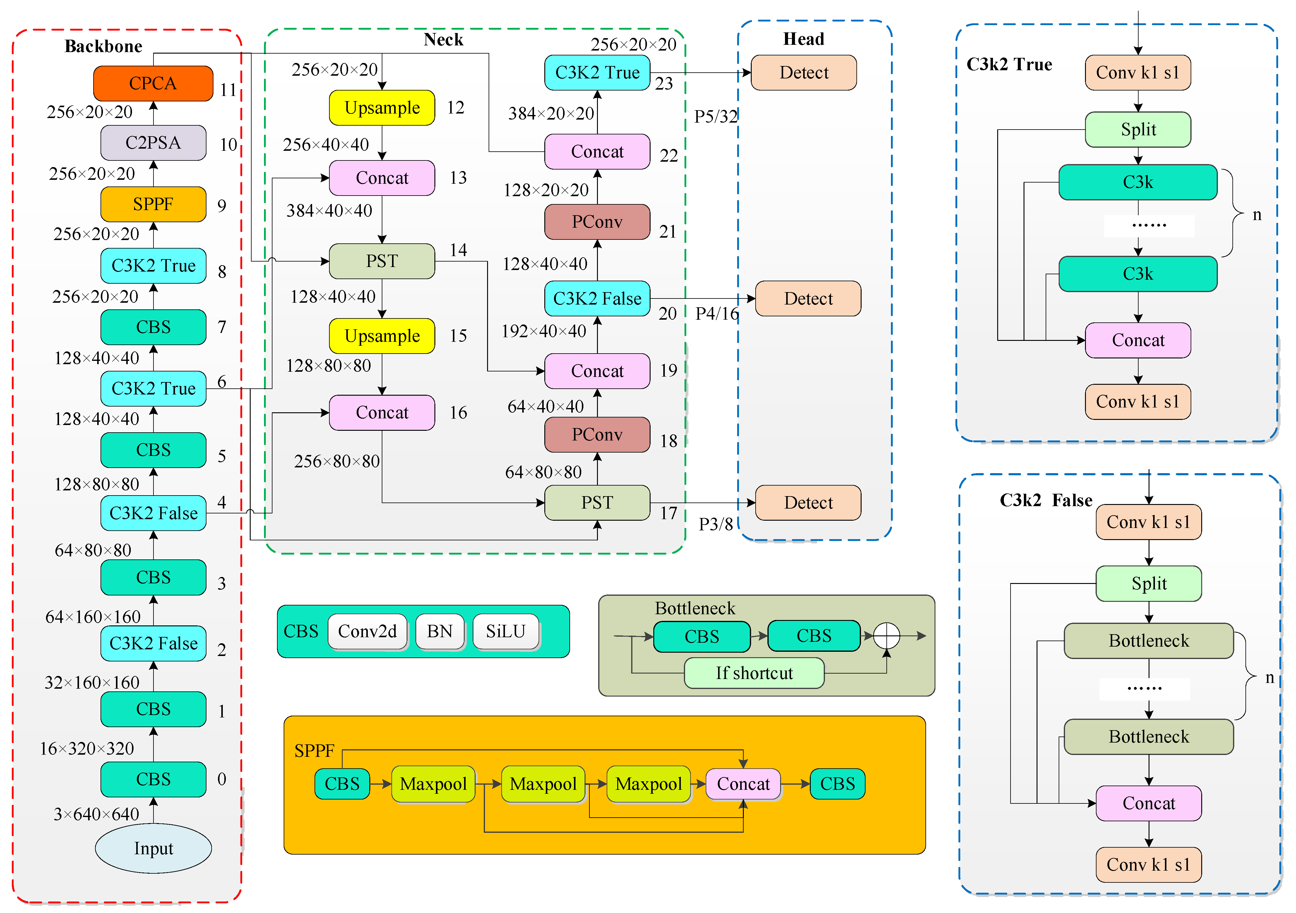 The Neck constructs a feature pyramid for multi-scale fusion using an FPN+PAN structure integrated with a PST module and Pinwheel-shaped Convolution (PConv). In the top-down pathway, deep features are upsampled and concatenated with their corresponding shallow features. The concatenated features are then processed by the PST module for efficient transformation and enhancement, which effectively preserves vital spatial details. Concurrently, in the bottom-up pathway, shallow features are downsampled using PConv, concatenated with deep features, and refined by C3k2 modules to fuse semantic information. This bidirectional architecture ultimately produces a powerful feature pyramid containing P3/8, P4/16, and P5/32 output levels.