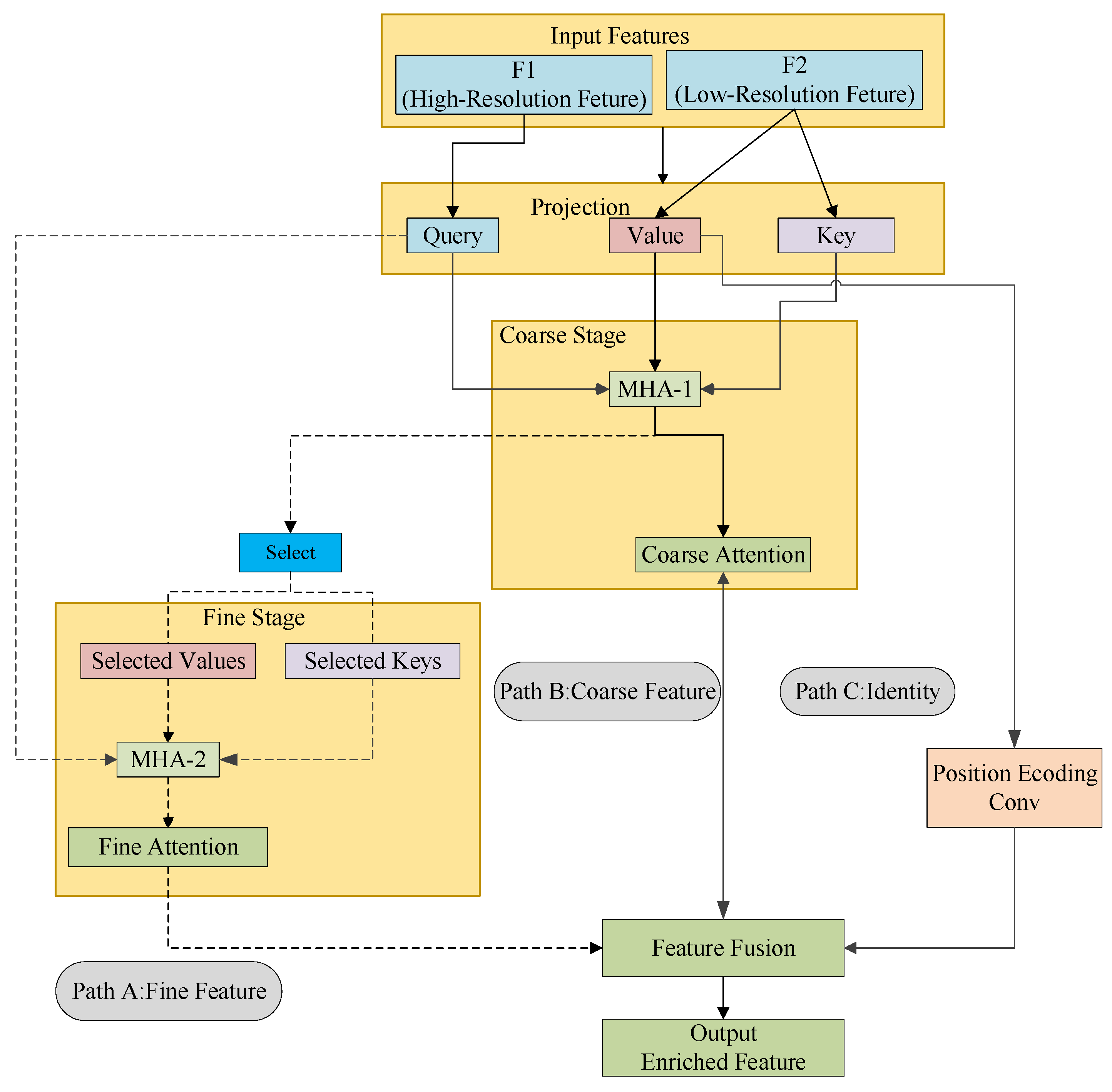 This path is responsible for efficient global modeling. We first derive queries (Q) from the fine-grained feature while keys (K) and values (V) are projected from the semantically rich, coarse-grained feature . This cross-layer setup allows high-level semantics from F2 to guide the enhancement of F1. The coarse attention is computed as . By operating on the downsampled token space of F2, this stage reduces the computational complexity to .