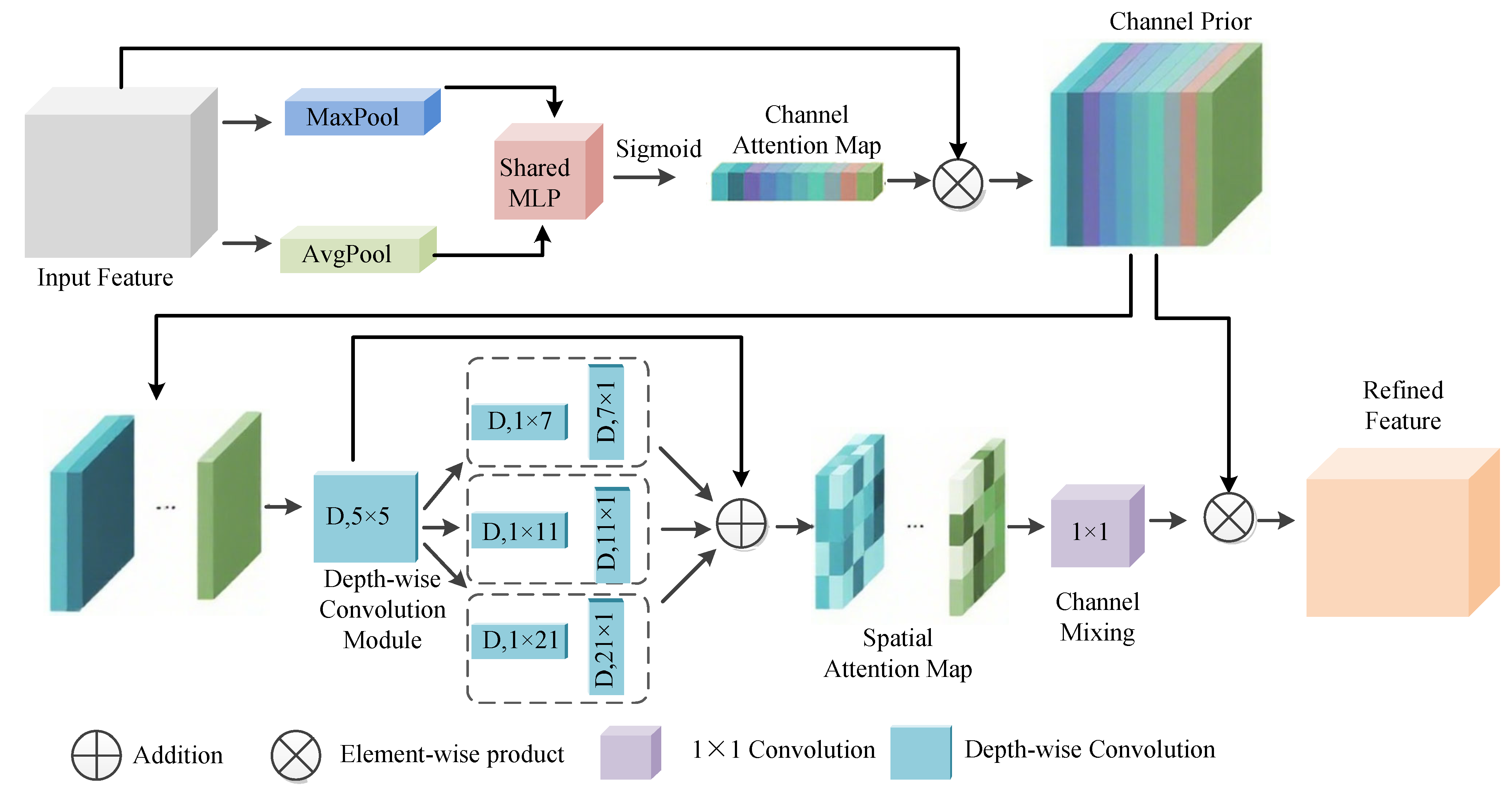 Furthermore, the multi-scale depth-wise convolution module incorporates structural symmetry through factorized kernels (e.g., using 1 × 7 and 7 × 1 convolutions), maintaining a balance in directional sensitivity. Their outputs are concatenated and fused by a 1 × 1 convolution, followed by a sigmoid activation, to produce a refined three-dimensional spatial attention map :