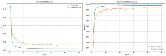 The performance gap is particularly evident when compared to the standard CNN-LSTM model, which our model outperforms by a significant margin: the proposed model achieves an F1-score of 99.41%, whereas the CNN-LSTM scores only 81.36%. CNN-LSTM’s recall is particularly low at 76.83%, indicating a failure to detect a substantial number of attacks. This highlights that the proposed model’s architecture, incorporating a residual autoencoder (ResCAE) and advanced optimization (SAM), provides substantially improved feature extraction and generalization capabilities compared to a standard CNN-LSTM.