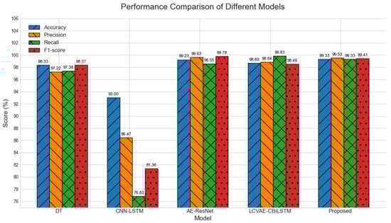 To evaluate the detection effectiveness of the proposed model, its performance was benchmarked on the CICIDS2017 dataset. For this experiment, a subset of the data was created by combining the normal traffic (from Monday) with all available attack traffic. This dataset was then partitioned into a 70% training set and a 30% testing set. The proposed model’s performance was then compared against several baseline models: DT [1], CNN-LSTM [35], AE-ResNet [13], and LCVAE-CBiLSTM [5]. The experimental results are summarized in Table 7 and Figure 9. As shown, the proposed model achieved an accuracy of 99.33%, a precision of 99.53%, a recall of 99.33%, and an F1-score of 99.41%.