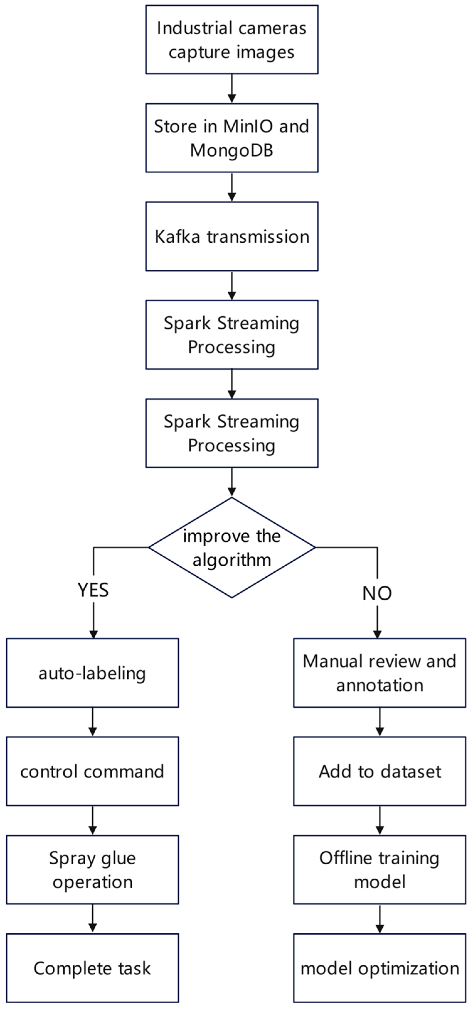 The proposed method for locating and sealing cracks in train doors consists of both hardware and software components. The hardware includes a sealant-spraying device equipped with an industrial camera, while the software comprises an image-based crack identification and localization algorithm. The overall processing flow is as follows. The first step is to use an industrial camera to collect information about the train side doors and directly store the collected images in the MinIO image library, while storing the metadata in MongoDB. The second step is to use Kafka components to directly send the image path and metadata. The third step is to use the Spark Streaming module to receive real-time information sent by Kafka, read images from the MinIO image library, and preprocess the images to prepare for subsequent recognition and localization. The fourth step is to input the graph data into the improved train door seam recognition and positioning algorithm. The fifth step is to process the graph data. If a door gap is detected, the positioning coordinates will be automatically marked and saved, and control instructions will be generated to control the device to perform the glue spraying operation and complete the sealing task; If the door crack is not detected, it will be added to the dataset for manual review and annotation, and then a new model will be trained offline to complete the improved algorithm for updating and optimization. The overall flowchart is shown in Figure 1.