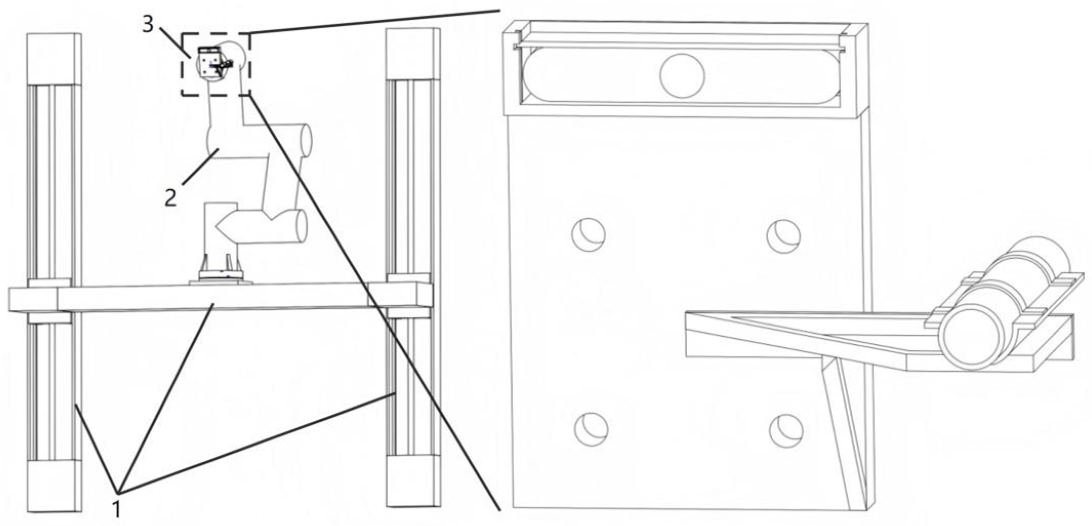 Figure 2. Structural diagram of the sealant-spraying device: (1) three-dimensional sliding module, (2) robotic arm, and (3) sealant-spraying unit.