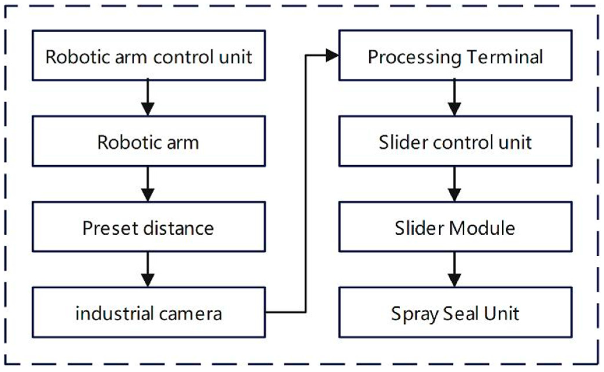 Figure 3 illustrates the workflow of the train door sealing process. Initially, the robotic arm control unit activates the robotic arm to perform rotation and translation, positioning the sealant-spraying unit at a predetermined distance from the gondola car. Once in position, the industrial camera embedded in the sealing unit captures images of the side door and transmits them to the processing terminal. The image processing algorithm then identifies the location of the door crack. Based on this positional data, the slider motion control unit drives the slider module to move the sealing-spraying sealing unit along the crack. The sealant-spraying mechanism is then activated to apply sealant along the detected crack, thereby completing the sealing process.