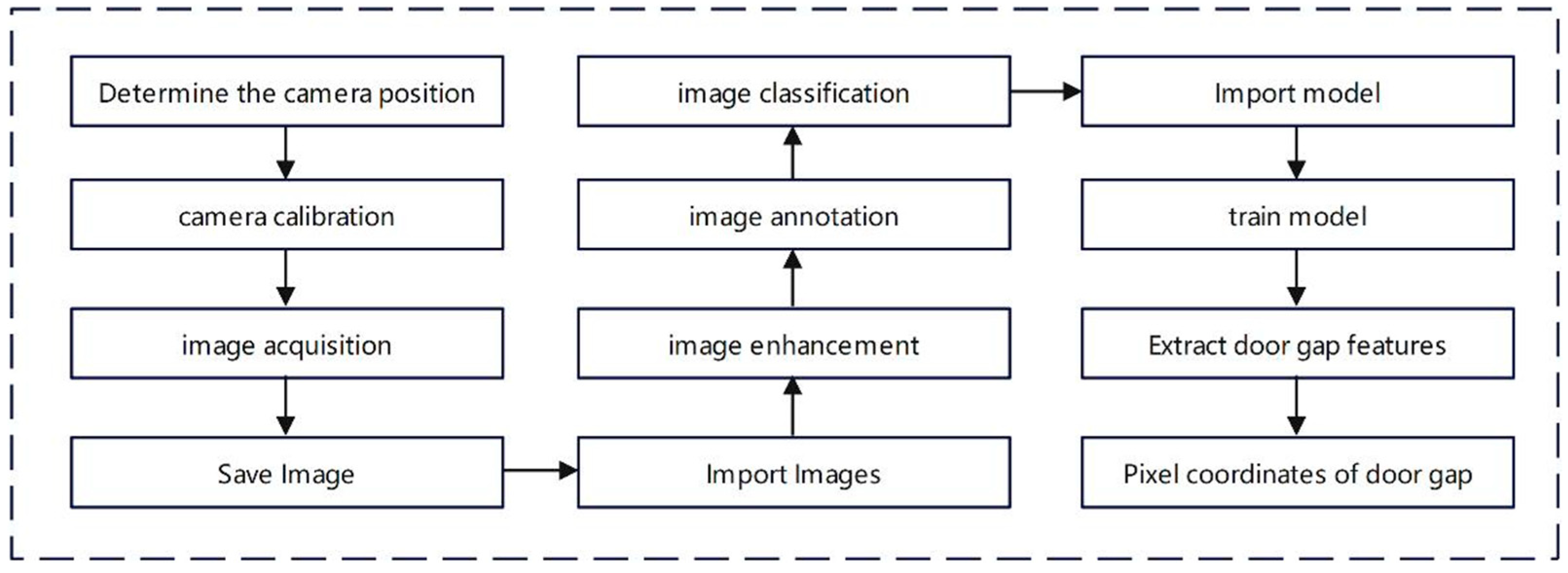The industrial camera first captures images of gondola car side doors under various conditions. These images are then preprocessed and annotated with side door axes to construct the dataset, which is divided into a test set, validation set, and training set at a ratio of 8:1:1. Using this dataset, a door crack detection model is developed based on the improved algorithm. During training, model parameters are tuned, including input data dimensions, the amount of object classes, and the amount of training iterations. Once trained, the model is used to detect door hinges in the input images. By applying camera calibration results, the spatial relationship between door hinges and door cracks is used to infer the position of the cracks. The final output includes the calculated position of the door cracks, which are then marked accordingly. Figure 4 presents the technical flowchart of the improved algorithm.