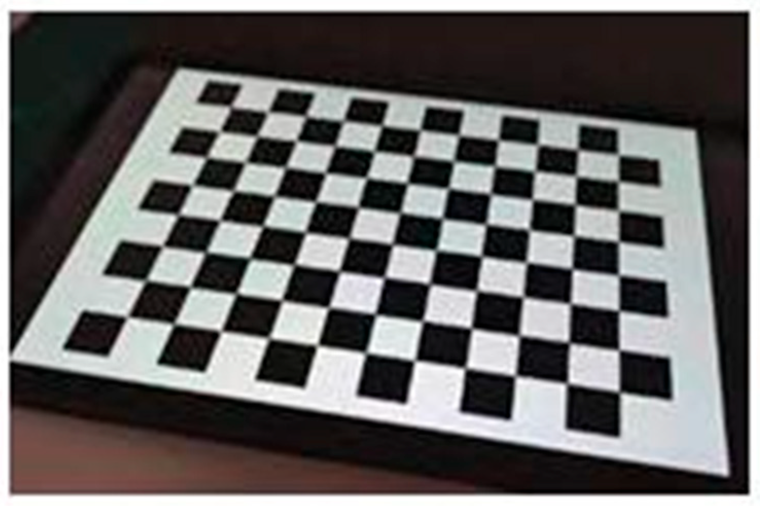 To establish the correspondence between pixel coordinates and real-world coordinates, this study employs Zhang’s camera calibration method [24]. This method involves capturing multiple images of a black-and-white checkerboard pattern from different angles. It is widely adopted for its flexibility, high accuracy, and robustness. A minimum of three checkerboard images is required to solve for the intrinsic parameters of the industrial camera. Table 1 shows the technical parameters of the industrial camera used in this article. Figure 5 shows an example image of the calibration checkerboard used in the process.