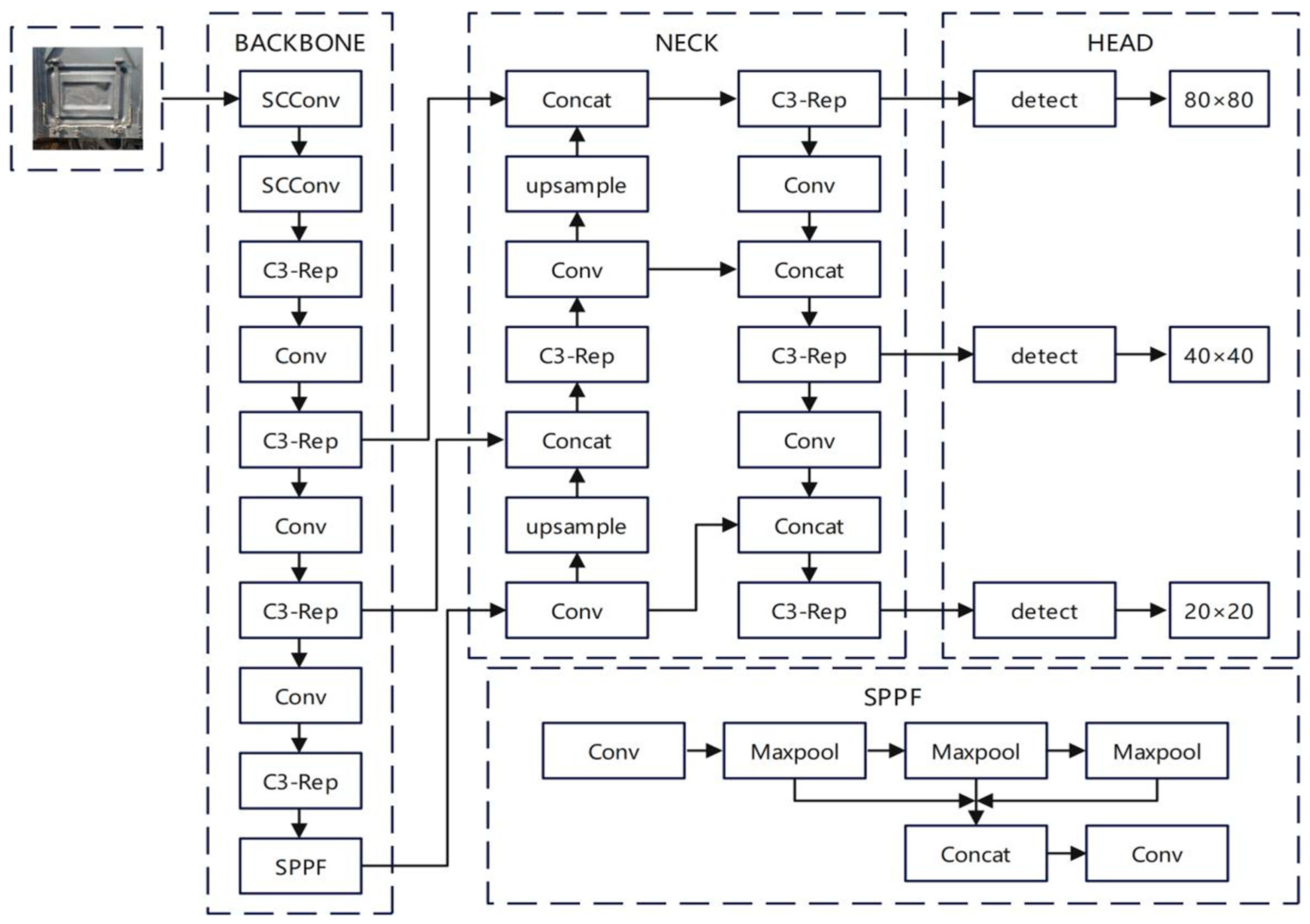 Specifically, several original convolutional (Conv) modules are replaced with selective context Conv (SCConv) modules [25], which help reduce redundancy in intermediate feature representations. Additionally, the original C3 modules are replaced with C3-Rep modules that integrate RepViT blocks [26], enhancing the network’s capacity to extract and interpret complex image features. To further improve training performance and accelerate convergence, the original CLoU function is replaced with the SLoU function [27]. Figure 6 shows the structure of the improved YOLOv5s network.