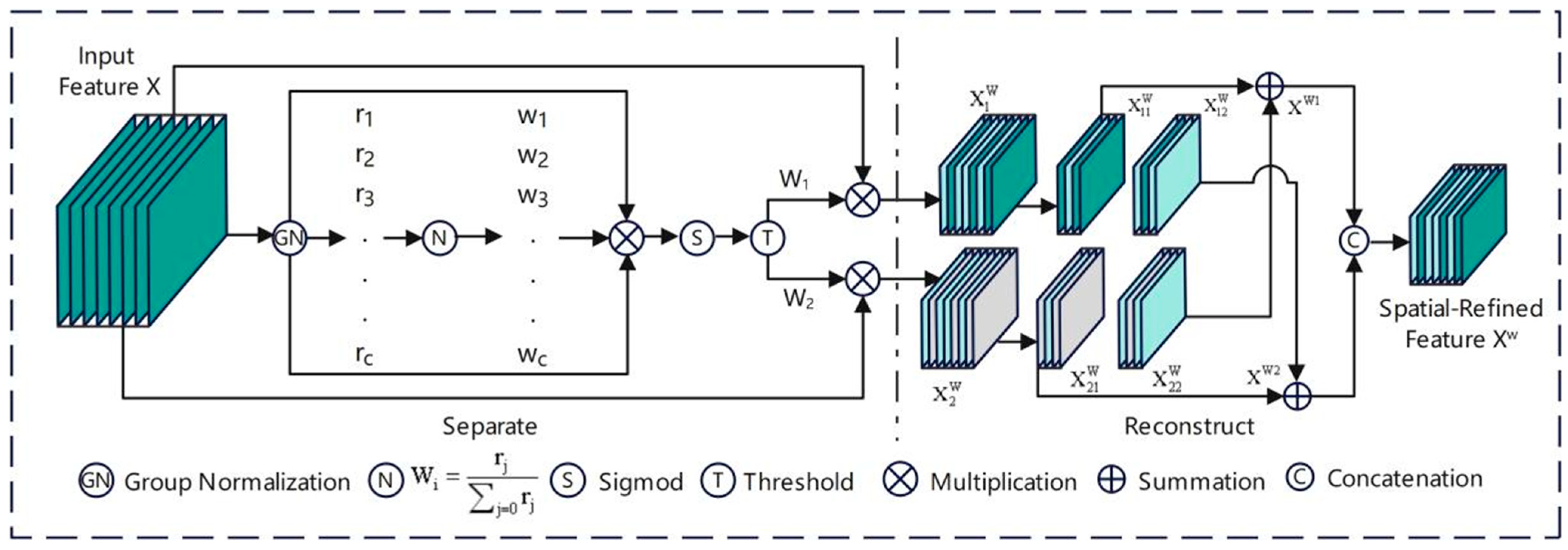 Figure 7 illustrates the structure of the SRU. The SRU is designed to suppress spatial redundancy and enhance the network’s feature representation capability by reweighting and reconstructing intermediate spatial features. It begins by applying group normalization (GN) to evaluate the input features using scaling factors. These features are then subjected to a mapping transformation that separates them into two distinct components, each containing different spatial information. These components are subsequently reconstructed into a new feature space through a series of operations. Finally, the two parts are concatenated to produce the output feature. By reconfiguring spatial information in this manner, the SRU significantly improves the utilization of spatial features within the image.