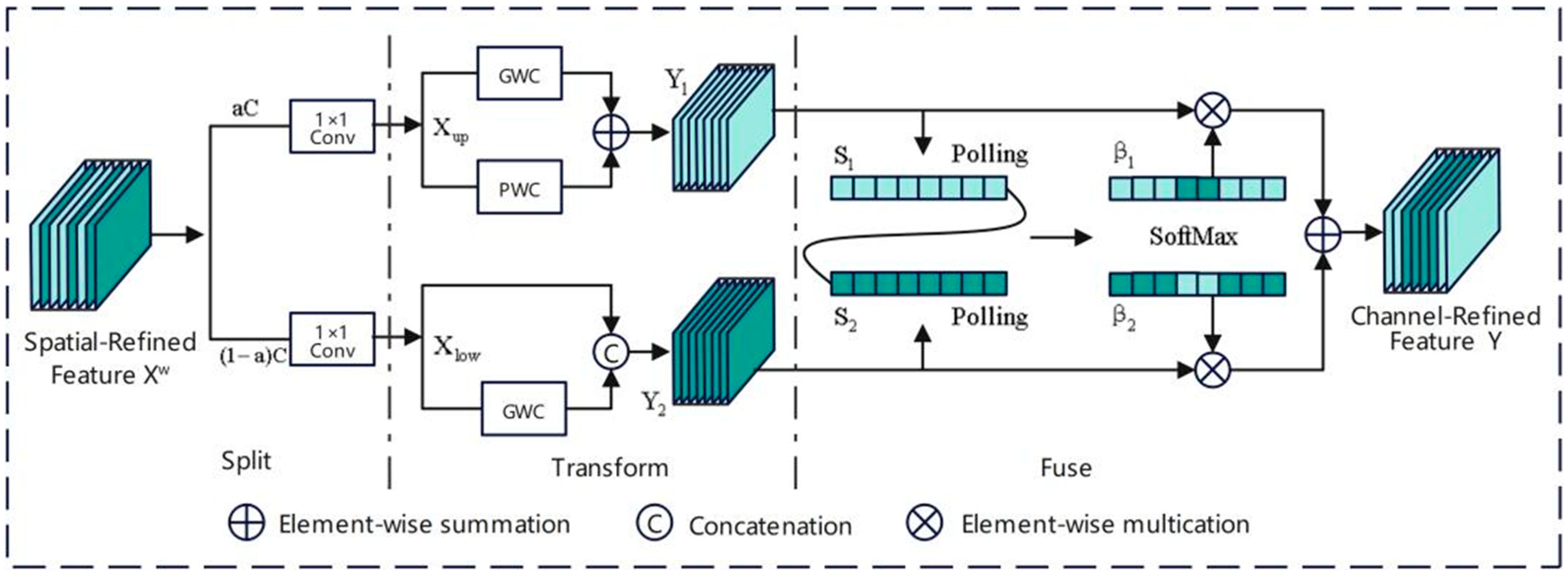 Figure 8 presents the structural diagram of the CRU, which focuses on enhancing feature representation in the channel dimension of the feature map. The CRU begins by dividing the input channels into two parts based on a predefined division ratio. Each part undergoes separate processing using pointwise convolution (PWC) and grouped convolution (GWC). The resulting low-dimensional features are concatenated to form two intermediate representations, denoted as Y1 and Y2. These are then passed through a pooling operation to generate corresponding scalars S1 and S2. A SoftMax function is applied to the concatenated pooled outputs to obtain channel attention weights β1 and β2. Finally, these weights are used to reweight the features, and the weighted features are summed to produce the final output.