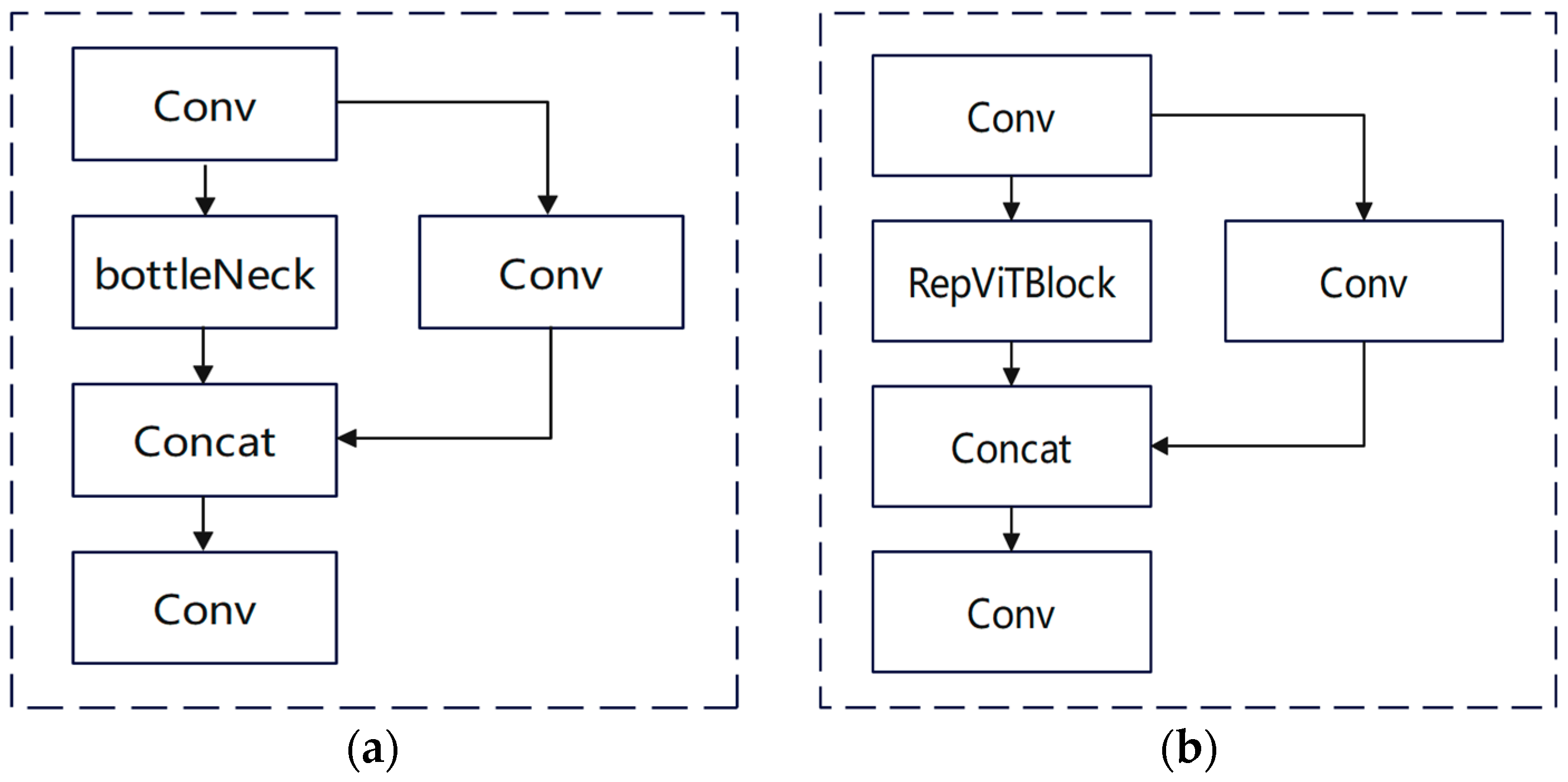 In YOLOv5s, the C3 module is composed of Conv, BottleNeck, and Concat operations, which are used to extract and fuse features from the input feature maps. While the C3 module helps reduce computational load and captures rich features, it can underperform in complex scenes due to redundant computations and inefficiencies in transmitting low-level features. To address these limitations, the RepViT block module is introduced as a replacement for the original C3 structure. Figure 9 illustrates the comparison between the original C3 module and the improved version incorporating RepViT block.