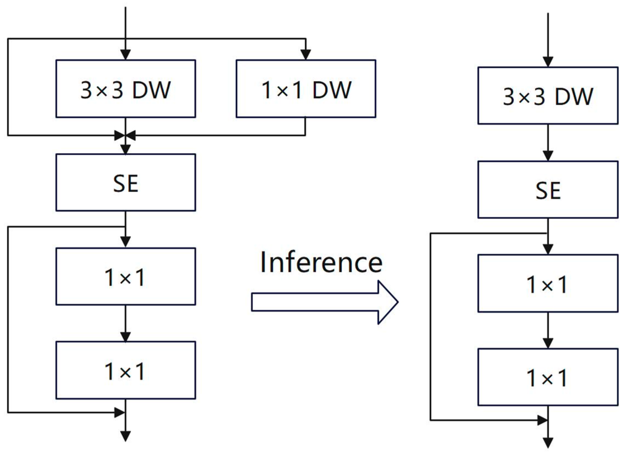 The RepViT block is a convolutional module derived from the RepViT architecture and designed for use in CNNs. It integrates the advantages of the ViT [28] and employs re-parameterization techniques [29] to significantly accelerate inference speed while maintaining high accuracy. The original MobileNetV3 module [30] combines extended convolution and projection layers to form a channel mixer. After a 1 × 1 extended convolution, a 3 × 3 depthwise separable convolution (DW) is used to fuse spatial information, serving as a spatial or “token” mixer. In RepViT block, to decouple the spatial mixer from the channel mixer, the DW convolution and the squeeze-and-excitation (SE) layer are moved earlier in the pipeline. During inference, the multi-branch deep convolutions are re-parameterized into a single-branch structure, reducing computational overhead and GPU memory usage. Additionally, the DW convolution layer—enabled by structural re-parameterization—eliminates the overhead associated with residual connections during inference. Figure 10 presents the architecture of the RepViT block.