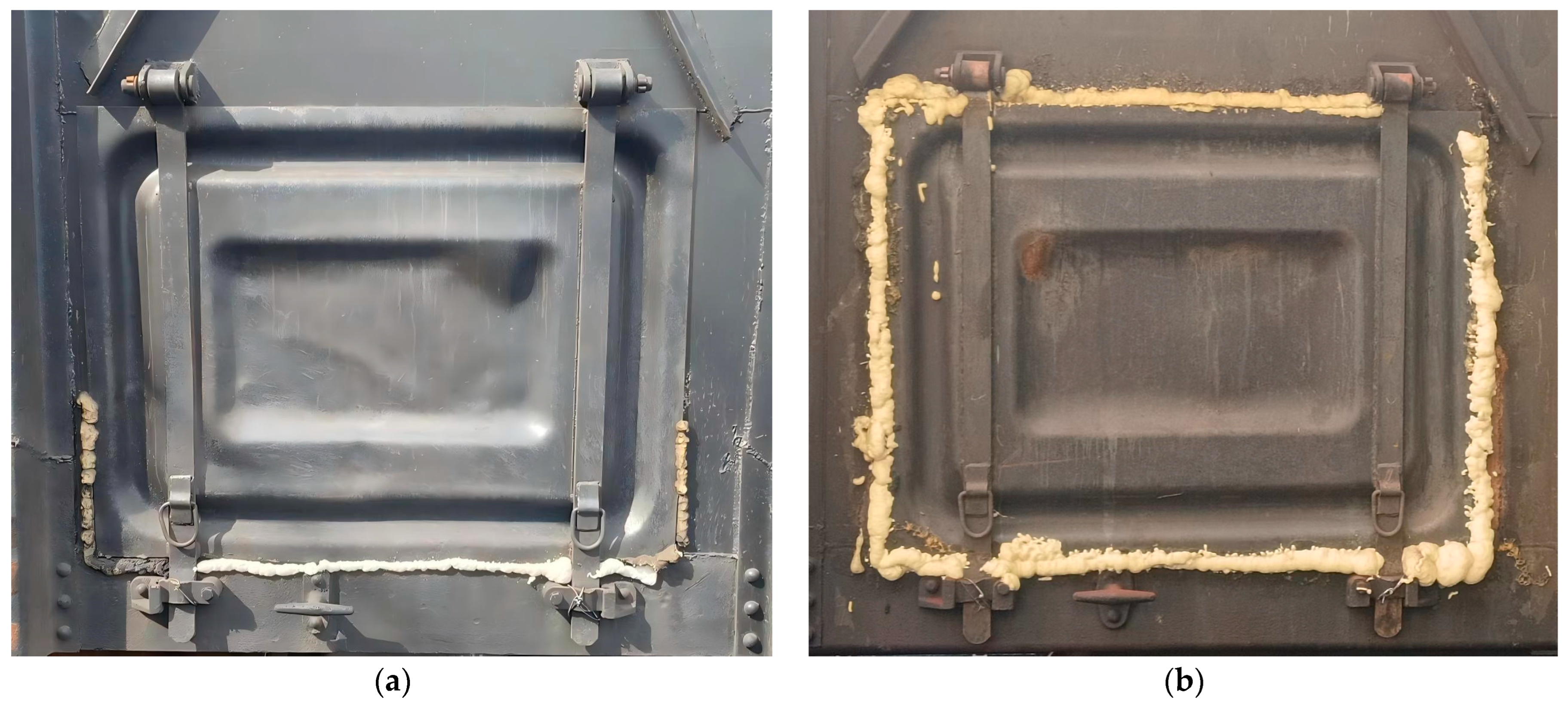 Figure 12. Dataset legend. (a) Picture of the new carriage door gap; (b) Picture of the old carriage door gap.