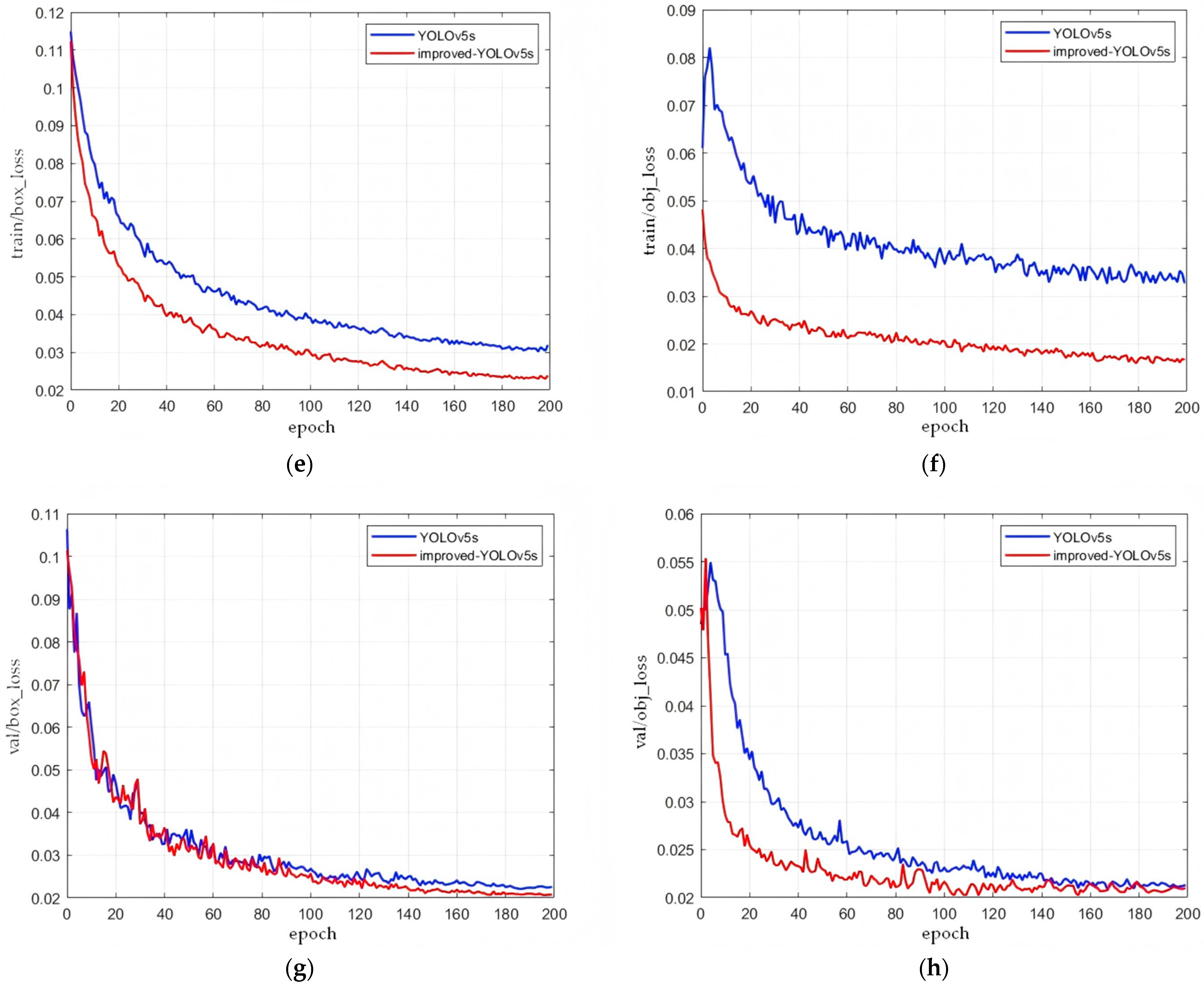 Figure 13. Model line chart: (a) precision, (b) recall, (c) mAP@0.5, (d) mAP@0.5:0.9, (e) train/box_loss, (f) train/obj_loss, (g) val/box_loss, and (h) val/obj_loss.