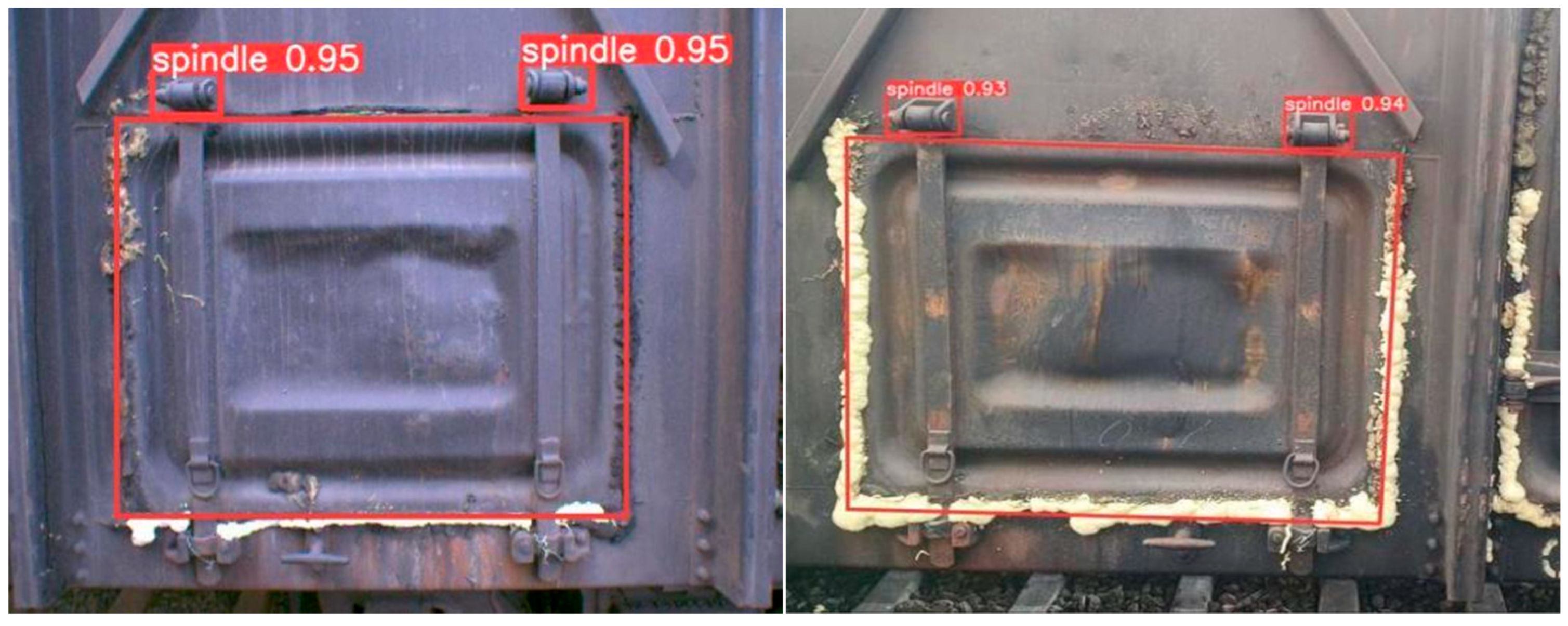 Due to the similar color between the gondola car’s side door and the surrounding side plate, directly detecting the door crack using the YOLOv5s algorithm is challenging. To address this, the algorithm is instead used to detect the round hinge pins on the gondola car and extract their pixel coordinates. The position of the door crack is then inferred based on the known spatial relationship between the hinge and the crack, along with actual dimensional measurements.