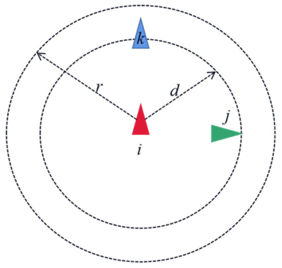 where i = 1, 2, …, N, , represents the perception radius and . Additionally, we model the relationships between agents as shown in the figure, where each agent is represented by a symbol. According to the definitions above, the safety radius of an agent is denoted by r, and the perception radius is denoted by d.