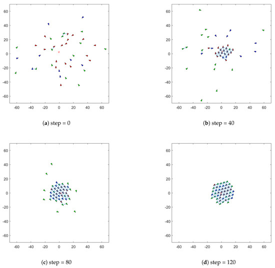 To study the dynamic behavior of swarm interactions based on Bayes’ Theorem, we mark the three groups of agents with triangles and distinguish them with different colors: red for the first group, green for the second group, and blue for the third group. Their initial positions and velocities are randomly and uniformly distributed within the range of (−1, 1) according to a normal distribution. The initial position and velocity of the virtual leader are both (1, 1). Additionally, the perception of interconnectedness between agents is represented by solid blue lines.