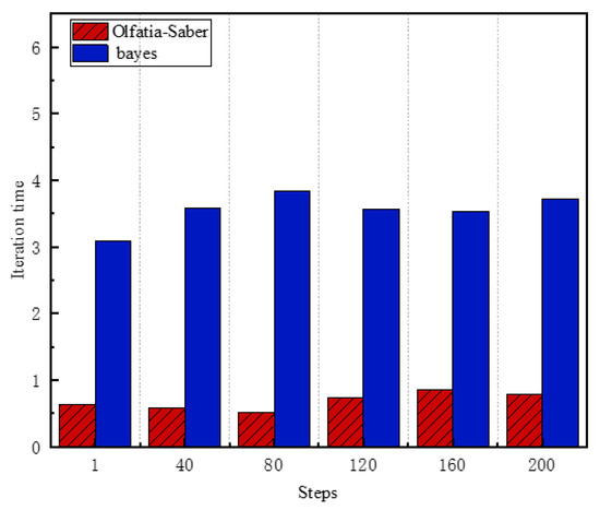 From the following Figure 3, it is clearly observed that compared to the traditional Olfati-Saber method, the iteration time using the Bayes method is significantly increased, which intuitively reflects the higher cost brought by the Bayes term in the calculation process. This is because the Bayes method needs to continuously integrate prior knowledge and real-time observational data during operation, updating the state of agents through complex probability calculations. However, this increase in computational cost is not meaningless. In swarm systems, the dynamic changes and uncertainties of the environment are challenges that cannot be ignored. The Bayes method, with its unique advantages, enables the swarm to better adapt to these complex situations, allowing agents to dynamically adjust their positions and velocities based on the state of their neighbors. Specifically, by calculating adaptive weights, the swarm can allocate weights more reasonably by combining the Gaussian kernel function considering relative positions and velocities, thereby more effectively integrating neighbor information with their own prior state. This mechanism allows agents to make better decisions when facing environmental changes. Although the Bayes method increases the computational complexity to some extent, it significantly improves the convergence quality.