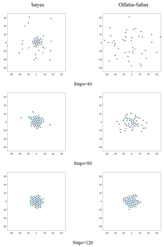 In Figure 4, the left side is the Bayes information interaction model, and the right side is the Olfati-Saber classical model. The Bayes method takes longer for each iteration, but its convergence process is more robust. As the number of iterations increases, the position and velocity deviations between agents gradually decrease with a lower fluctuation range, indicating that the system is more orderly and reasonable when converging to a stable state, better meeting task requirements. In contrast, the Olfati-Saber classical model may still exhibit slight oscillations after convergence. According to the three iterative process diagrams provided, the Bayes and Olfati-Saber classical models show significant differences in dynamic evolution (Iteration = 40, 80, 120). When Iteration = 40, the Bayes information interaction model gradually aggregates information between agents through its unique probability update mechanism, causing the probability distribution to show a preliminary aggregation trend, and the posterior probability begins to deviate from the prior distribution. This is because Bayes updates its probability estimates in a progressive manner based on the neighbor information received each time, while the Olfati-Saber model has not yet established strong connections between agents. When Iteration = 80, the Bayes information interaction model continues to perform local interactions between agents, and these gradual accumulations of information interactions have a significant effect, with the probability density function showing significant modal differentiation, fully demonstrating the “cumulative evidence effect” of Bayes. Each small-scale information interaction is like accumulating evidence, gradually shaping the form of the probability distribution, while the classical model begins to show significant aggregation. When Iteration = 120, the Bayes posterior distribution is basically stable. In this process, Bayes continuously adjusts its state through small amounts of information exchange with neighbors, while the classical model has just entered the collaborative stage. Both models have completed convergence, but the Bayes posterior distribution presents a unimodal symmetric form. It can be seen from the figure that compared to the classical model, the Bayes method requires significantly fewer iterations. Although both models will show convergence after a certain number of iterations, the Bayes method has already stabilized completely, while the Olfati-Saber classical model may still exhibit slight oscillations.