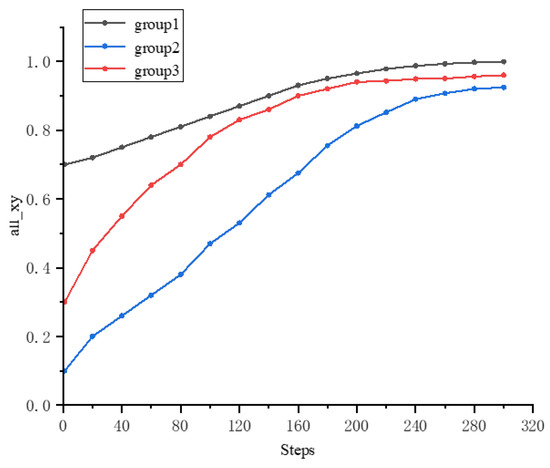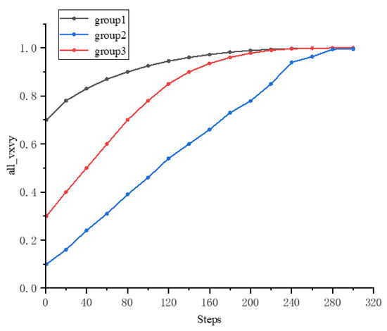 As shown in Figure 2, the red-marked first group of agents 1 = 0.7 exhibits the fastest convergence speed, quickly moving towards the virtual leader’s state in the early stages of iteration. The blue-marked third group of agents 3 = 0.3 begins to show a convergence trend after the red group reaches a preliminary convergence. The green-marked second group of agents 2 = 0.1 demonstrates a significant lag in response. The entire convergence process is characterized by multiple stages: a rapid convergence stage, a gradual diffusion stage, and a final convergence stage. A higher information awareness rate can first form a convergence core and significantly improve the agents’ response efficiency to the global goal, then drive the agents with a medium information awareness rate through swarm interaction. The agents with a lower information awareness rate show a lag in response, and their convergence behavior requires a significantly longer iteration cycle to become apparent. This indicates that the lower limit of the information awareness rate directly affects the time scale for the swarm to reach consensus. The experimental results verify that in distributed swarm intelligence systems, even with significant differences in individual information acquisition, the system can still achieve global consistency through appropriate interaction mechanism design.