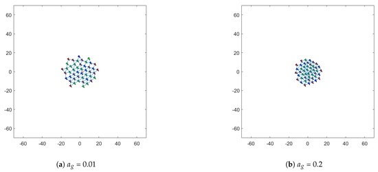 As shown in Figure 1, When the distance between agents is less than d, that is, , agent i exhibits repulsion to avoid collision with agent j. In contrast, when the distance between agents is greater than d, that is, , agents will attract each other to achieve aggregation. Furthermore, when the distance between agents is equal to d, agents i and j remain stable.