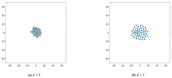 As shown in Figure 9, comparative analysis based on safety radius indicates that when d = 3, the internal distribution becomes uneven and chaotic, with excessive density in localized areas triggering internal oscillations. When d = 7, the group exhibits an abnormally loose spatial distribution, resulting in longer propagation paths within the group and excessive internal space leading to resource wastage. Therefore, both excessively high and excessively low safety radii disrupt the spatial structural equilibrium of the group, leading to decreased collaborative efficiency and compromised stability.