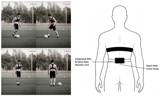 During the experimental trials, participants were instrumented with an integrated IMU unit and a chest-strap heart-rate monitor, and standardized sport-specific movement tasks were performed while synchronized kinematic and physiological signals were recorded Figure 2. As shown, the wearable sensors were positioned at the waist and chest to ensure stable attachment and consistent measurement throughout the protocol.